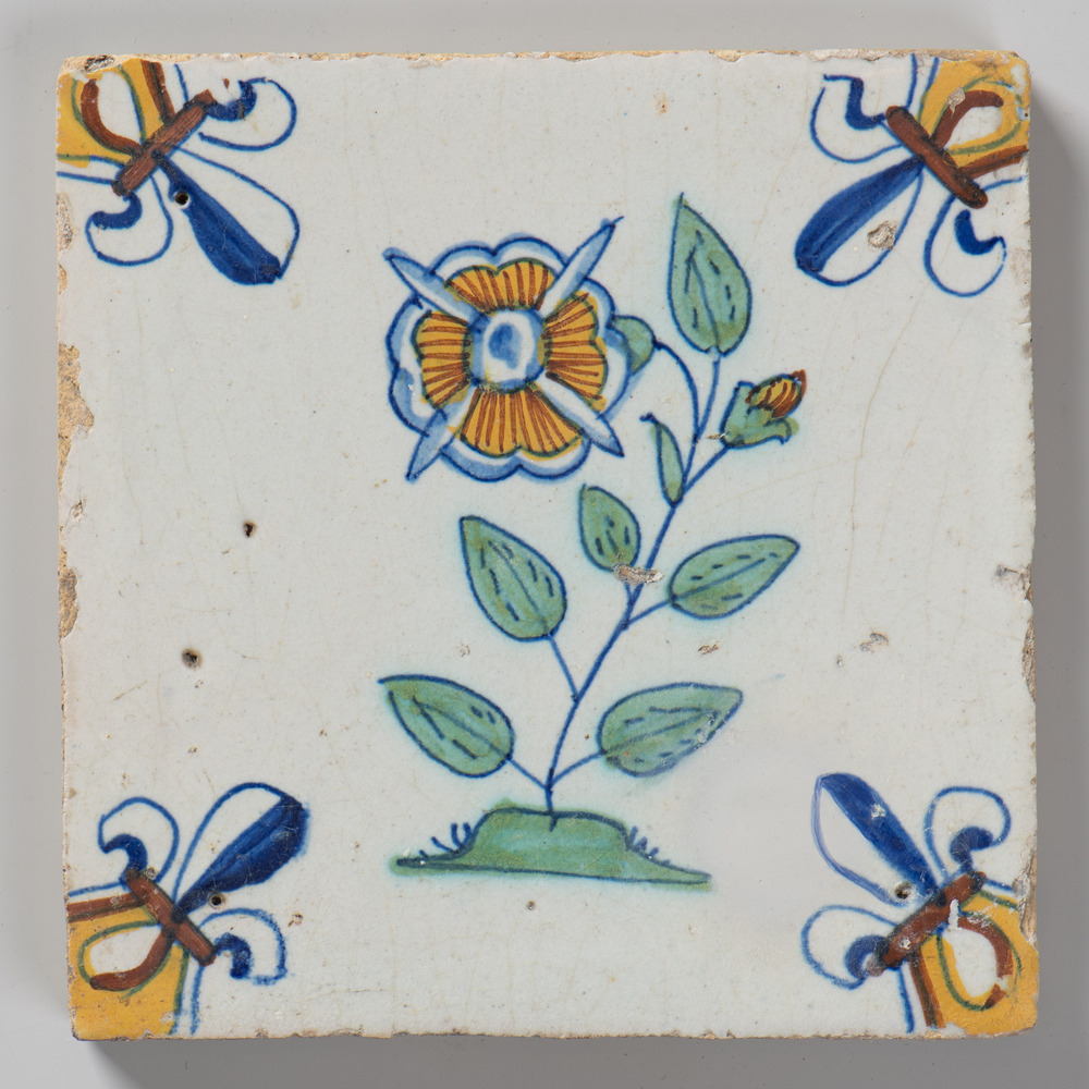 tegel van keramiek met tinglazuur, voorstellende: bl...