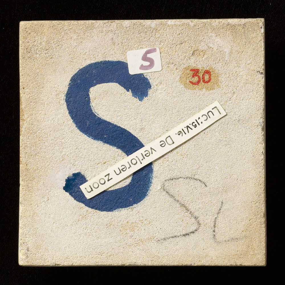 Tegel van keramiek met tinglazuur, voorstellende: De...