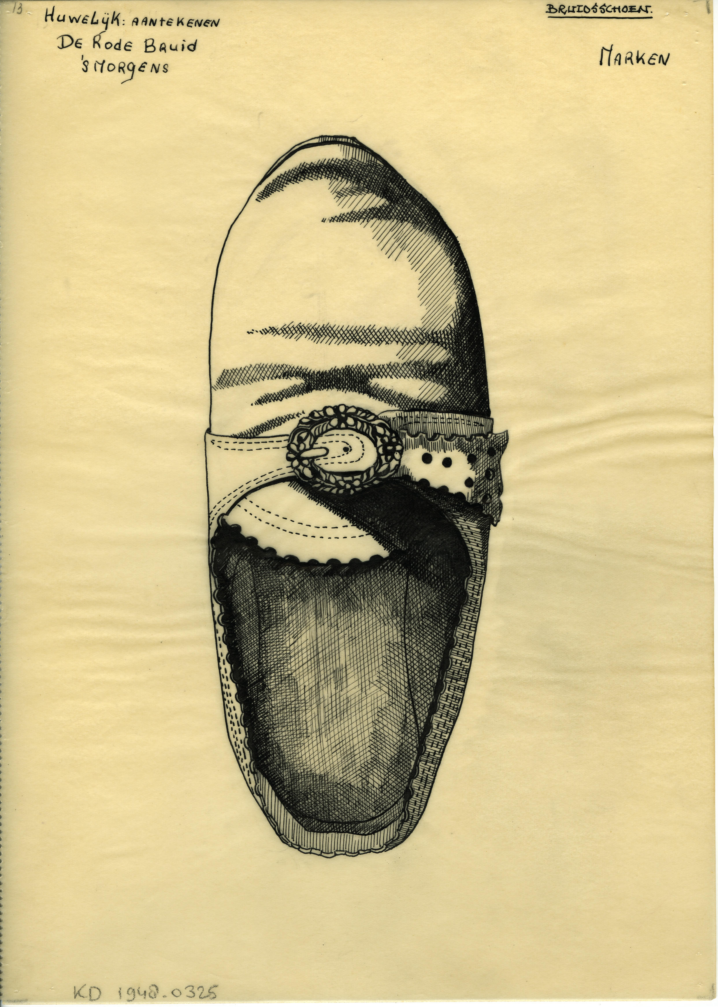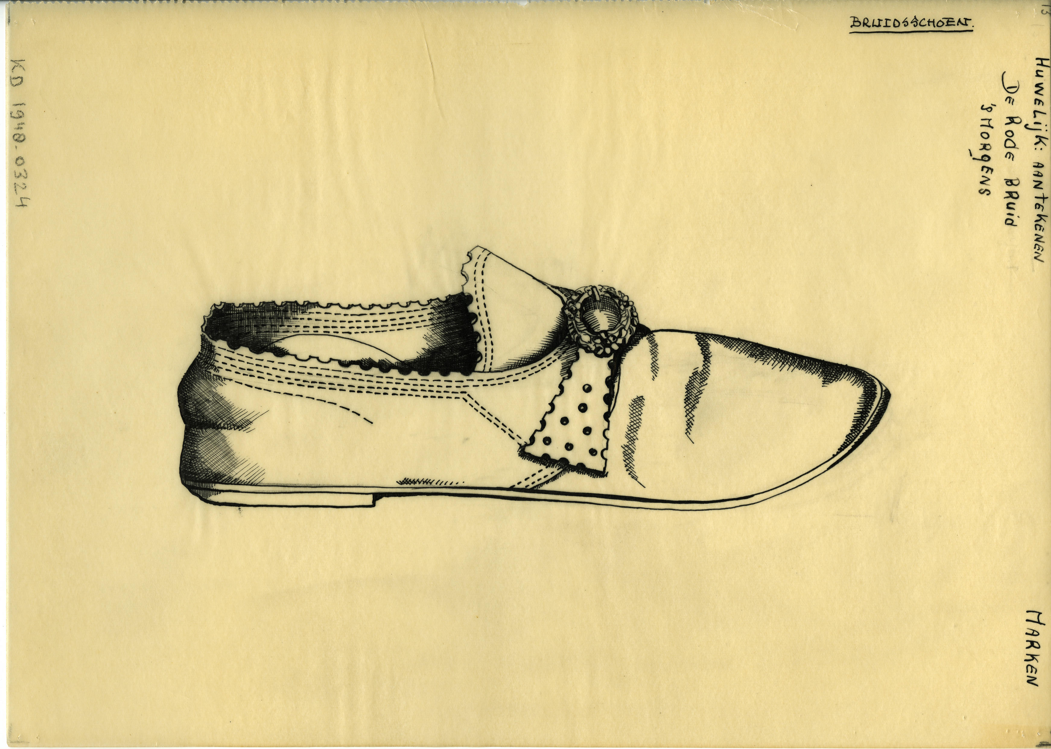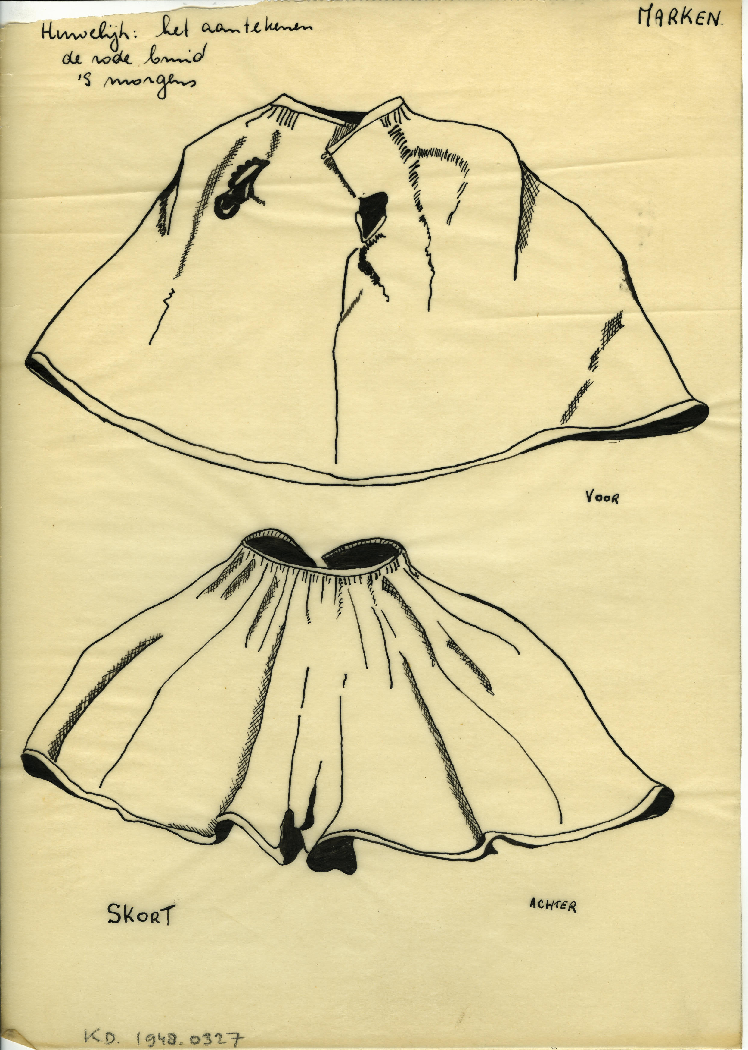 Tekening van een wit 'bruidegomsrokkie', Marken (pat...