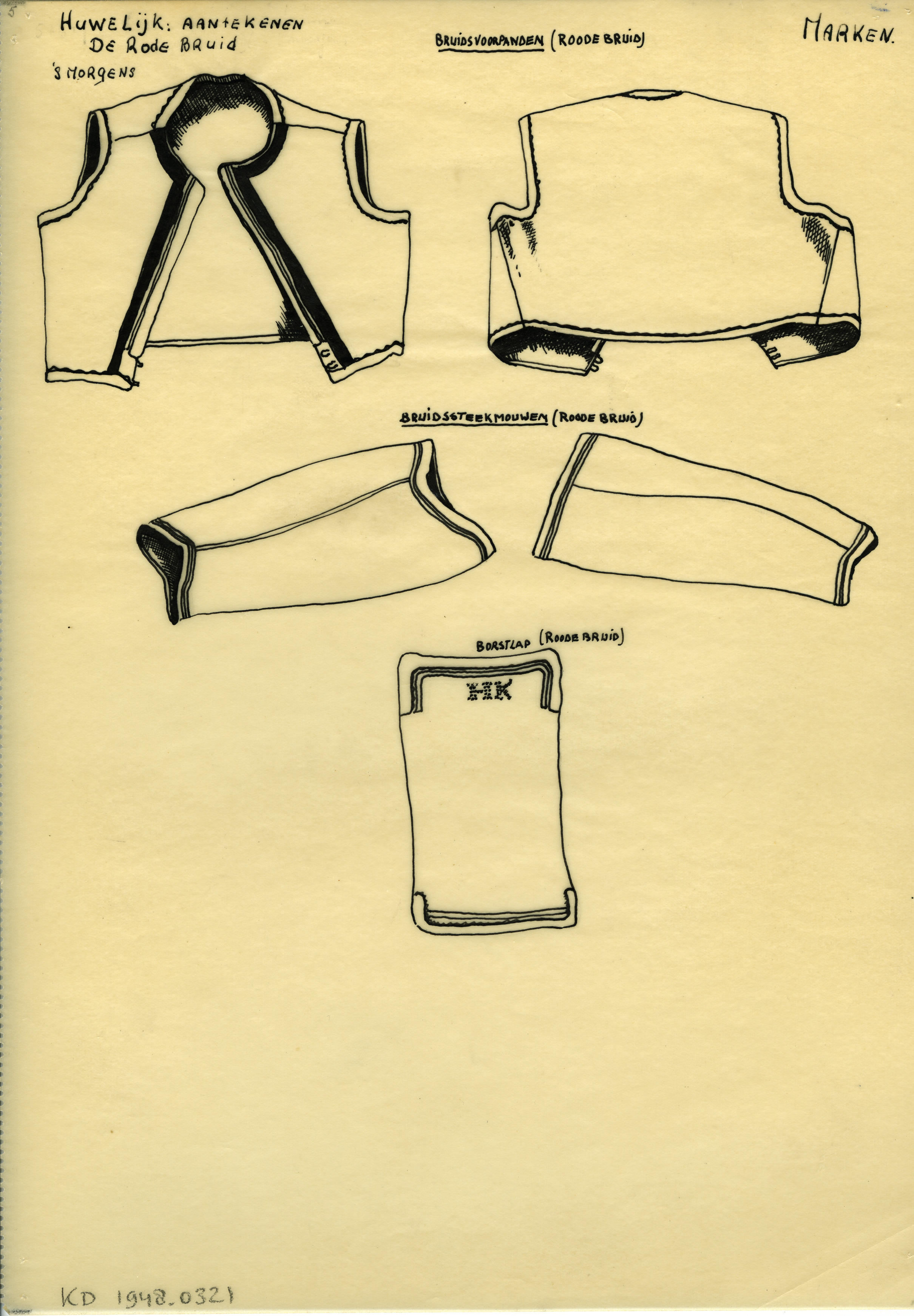 Tekening van antieke rode mouwen, Marken (patroontek...