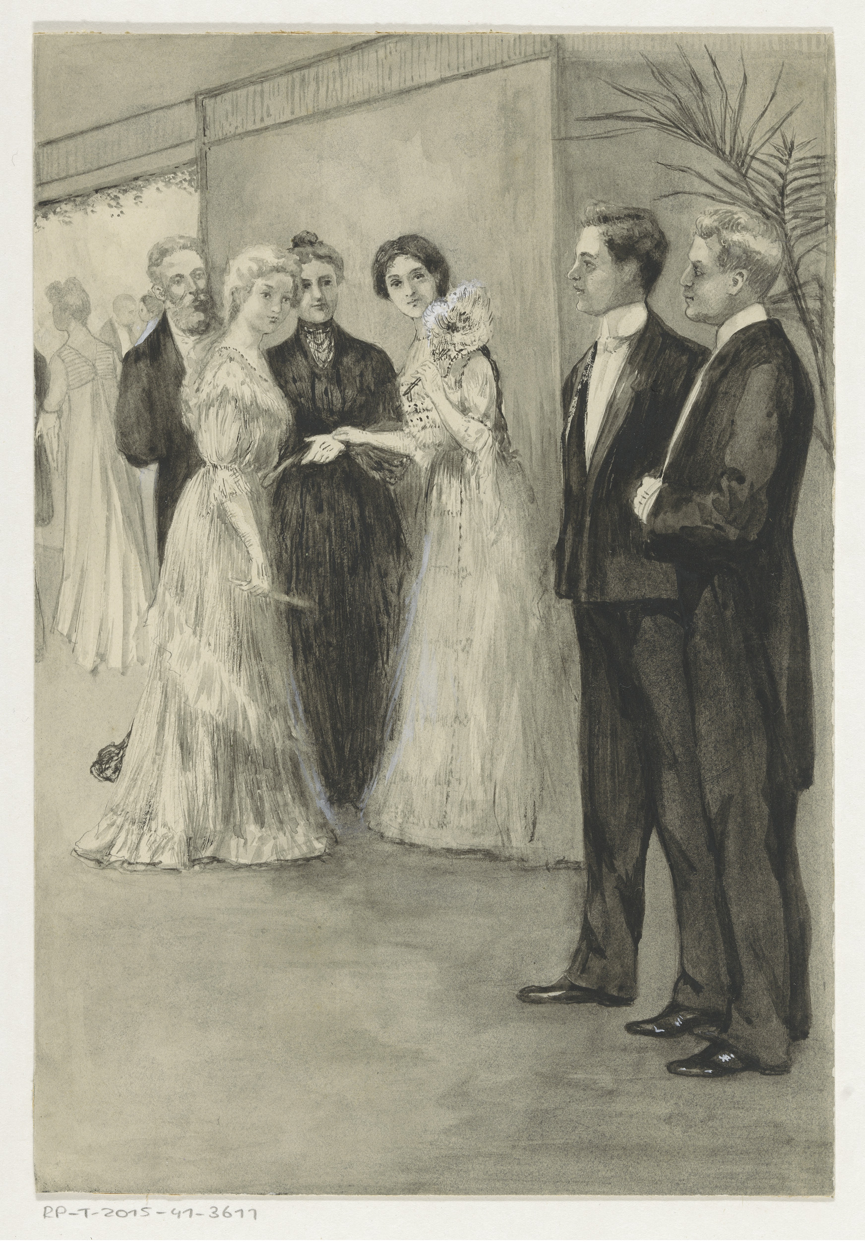 Zusjes in avondkleding bekijken twee jongemannen