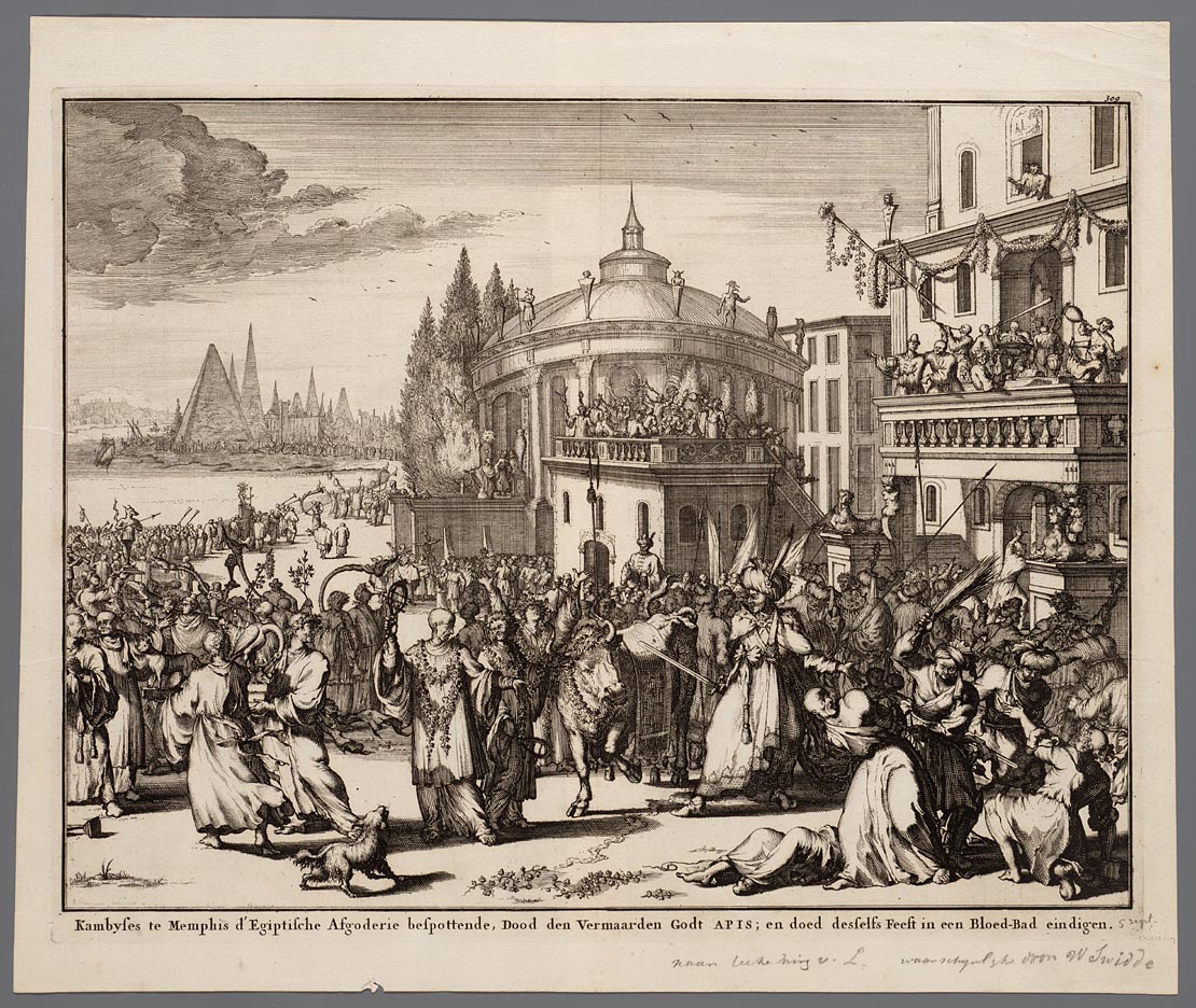 Kambyses te Memphis d´Egiptische afgoderie bespottende