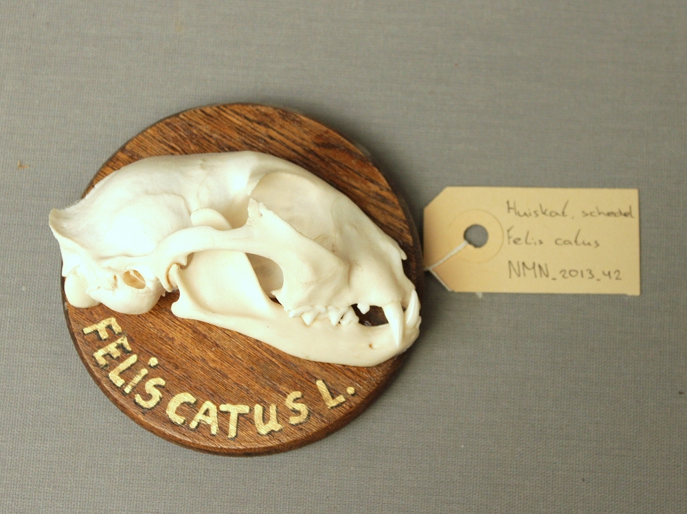 Schedel huiskat, gehalveerd op plankje