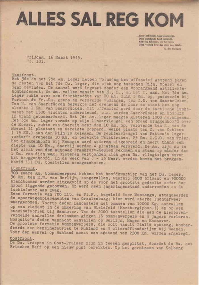 Alles sal reg kom. Vrijdag, 16 Maart 1945. No 131.