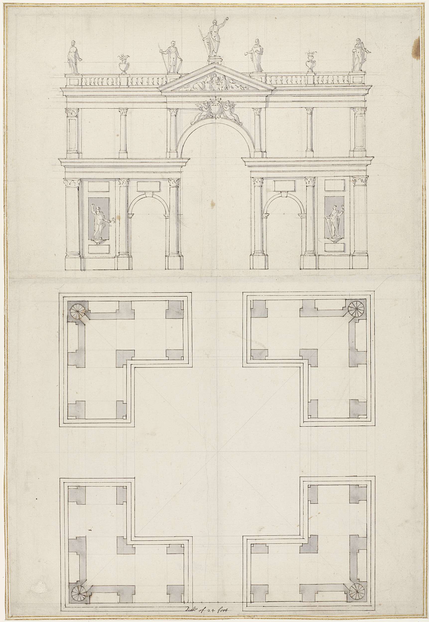 Vier bladen met architectuurtekeningen naar lijstwerk