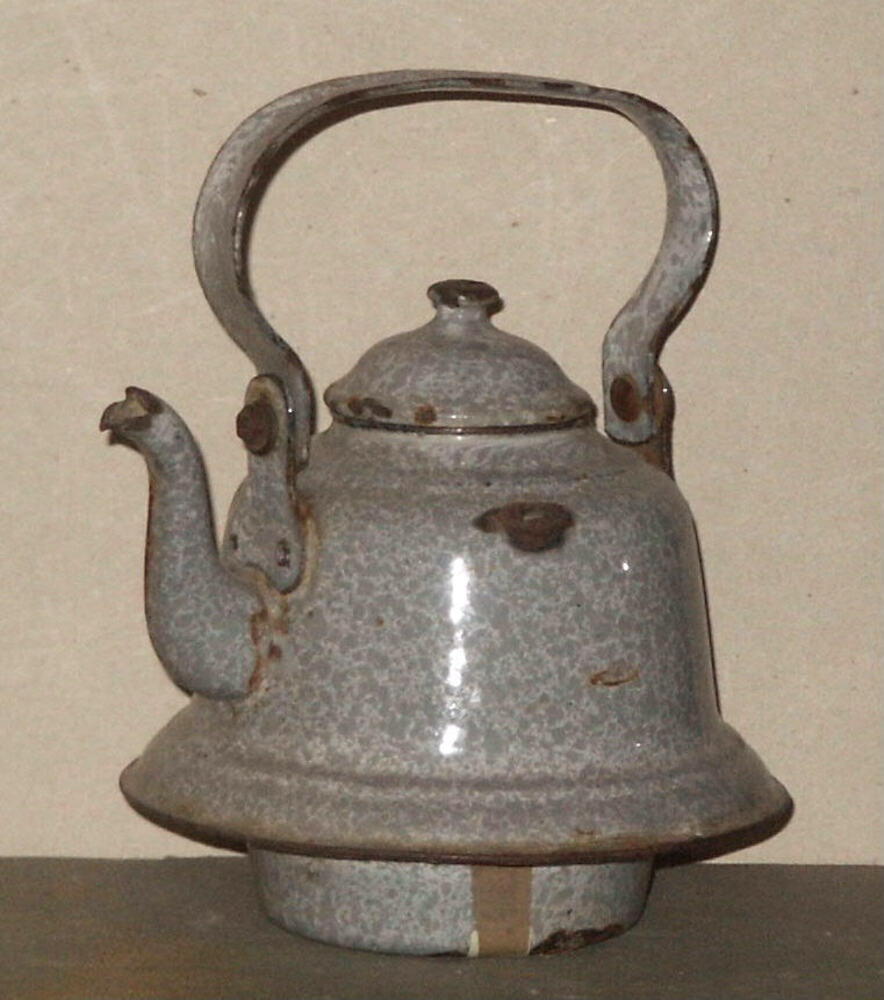 speelgoed waterketeltje, grijs geëmailleerd, circa 1900