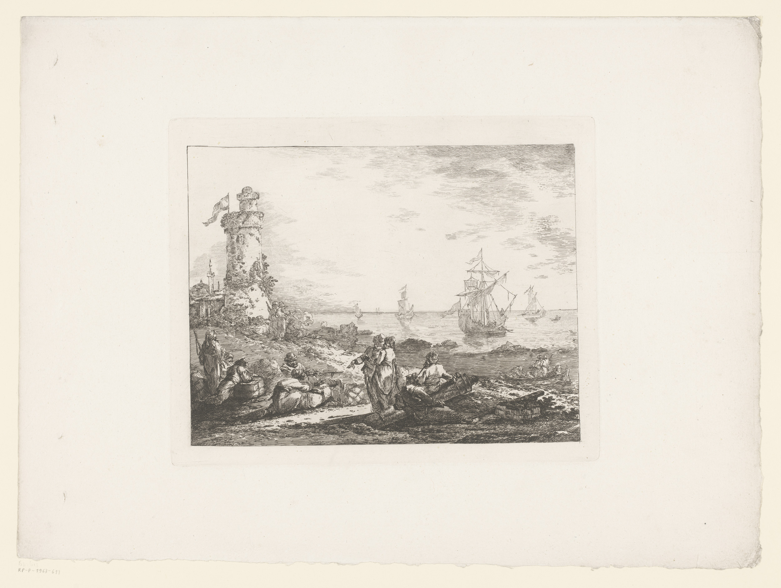 Landschap met aangemeerde zeelieden