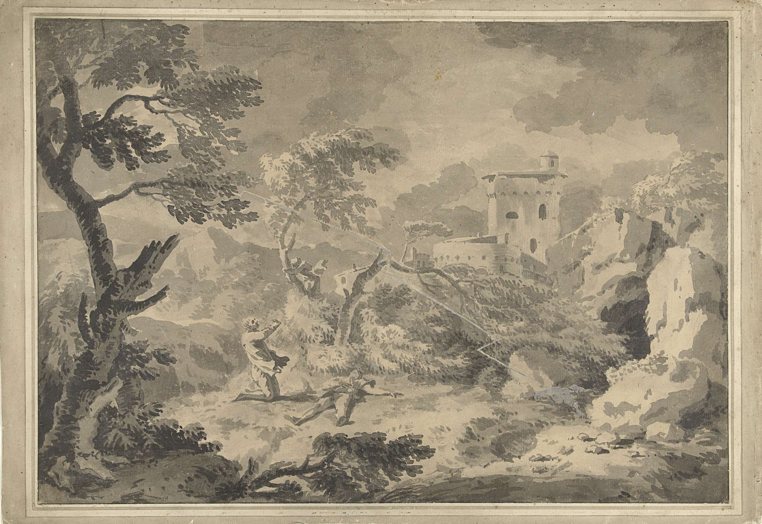 In een landschap slaat de bliksem op de voorgrond in