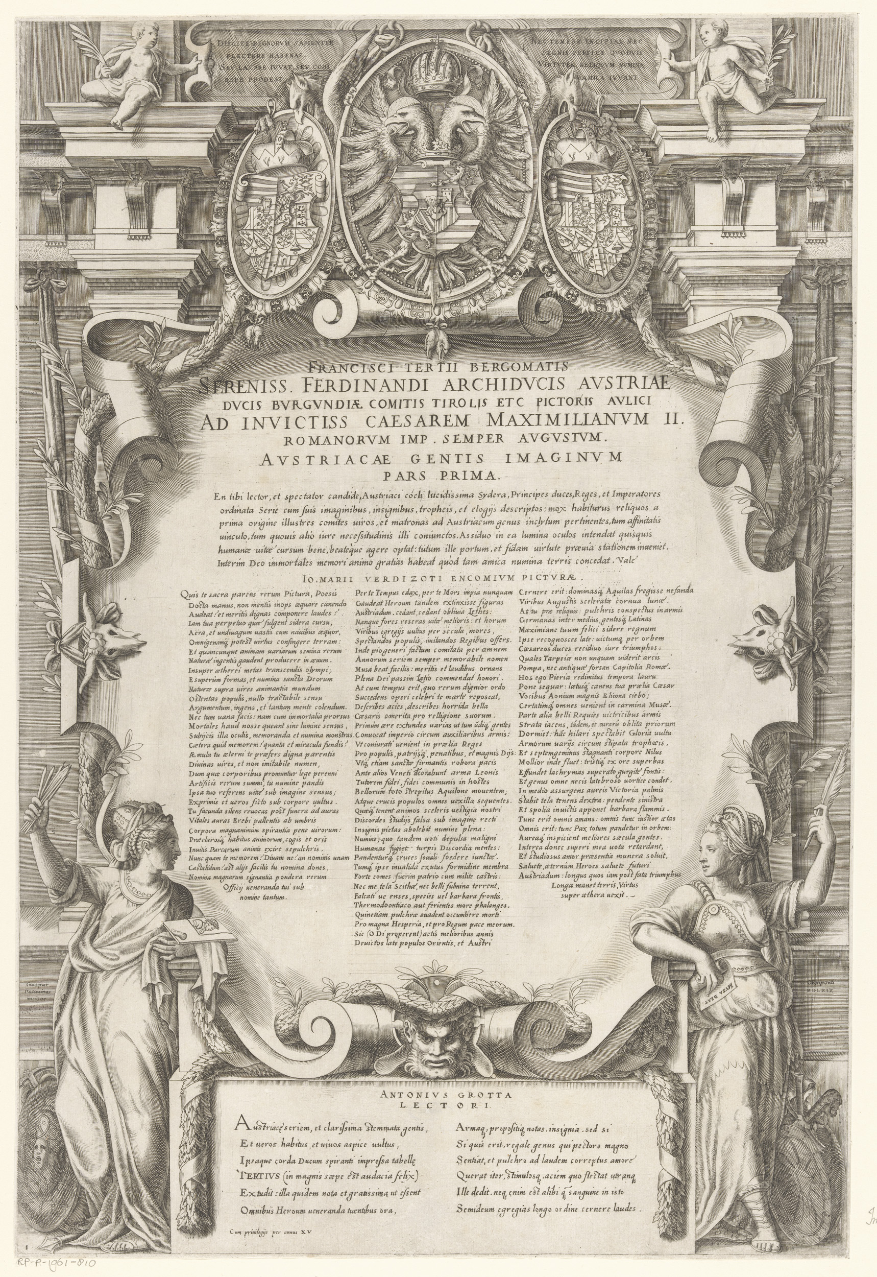 Titelprent met tekst, vrouwen met takken, wapenschil...
