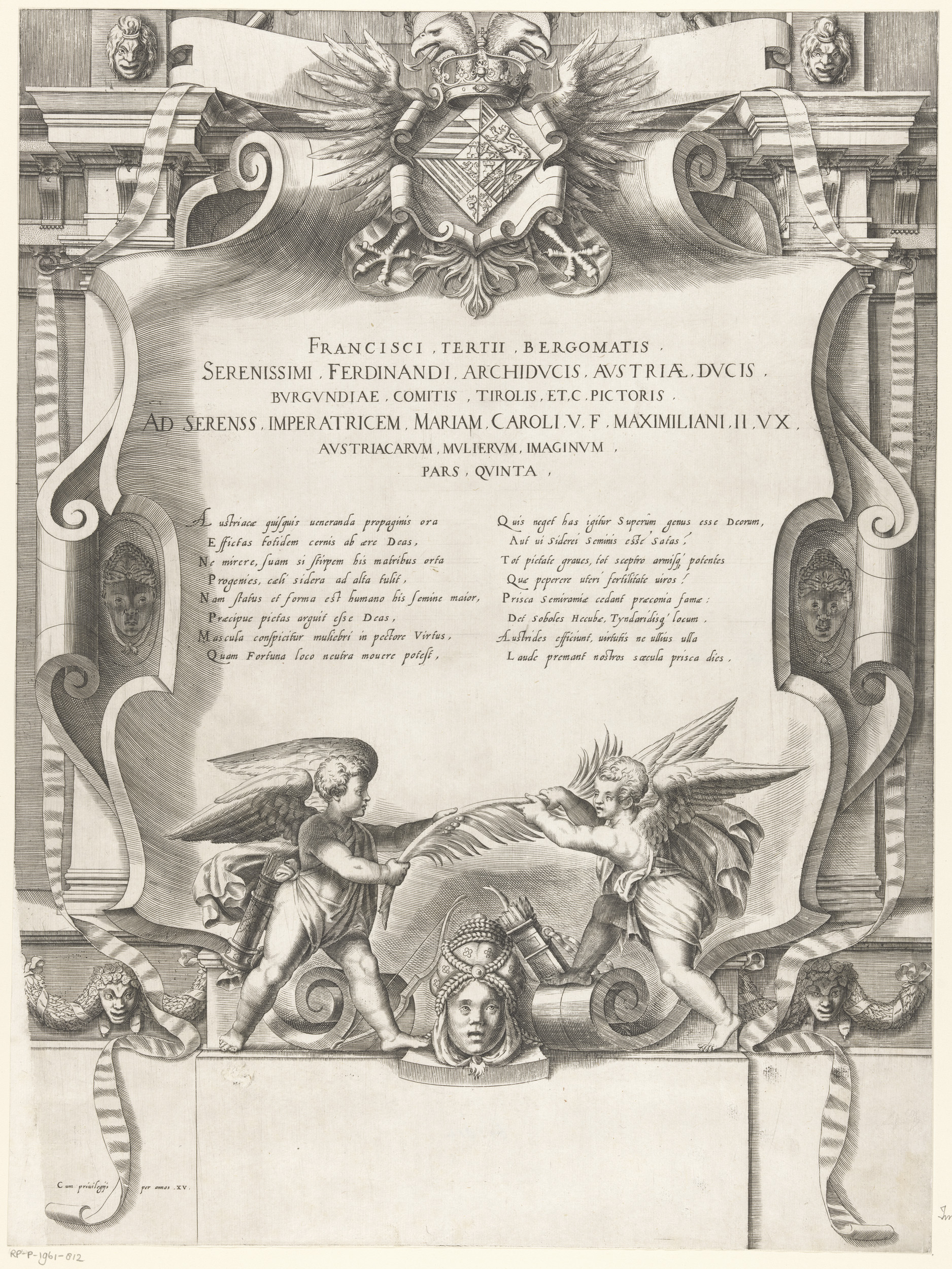 Titelprent met tekst, wapenschild, ornament en putti...