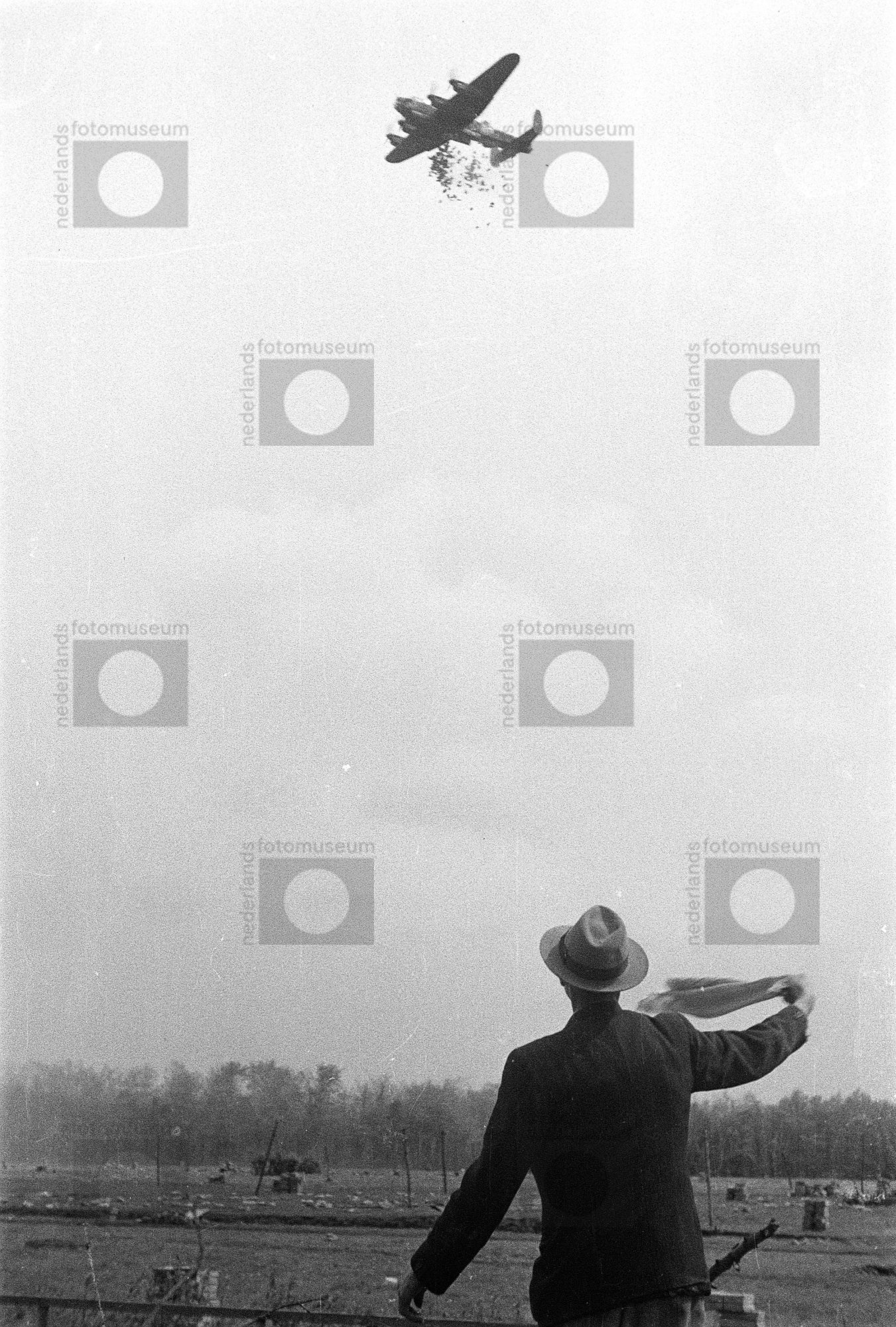 Een geallieerd vliegtuig dropt voedsel boven Den Haa...