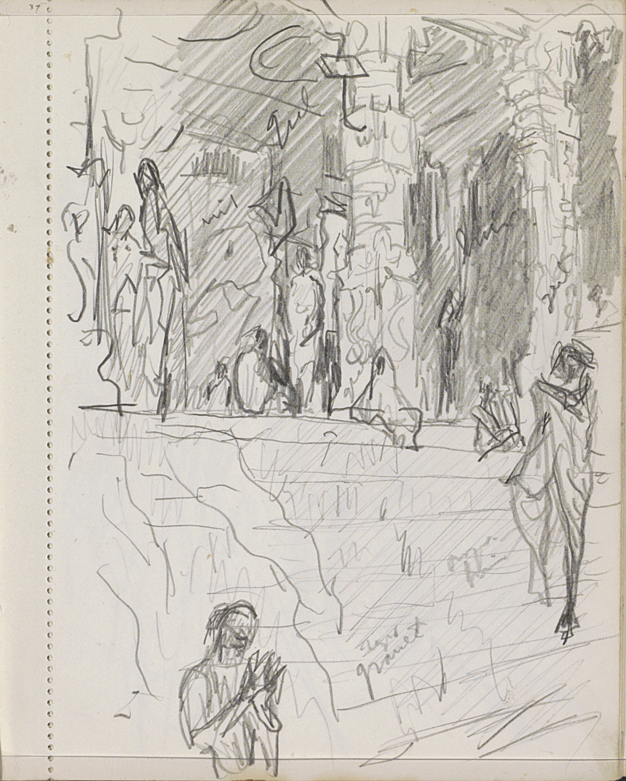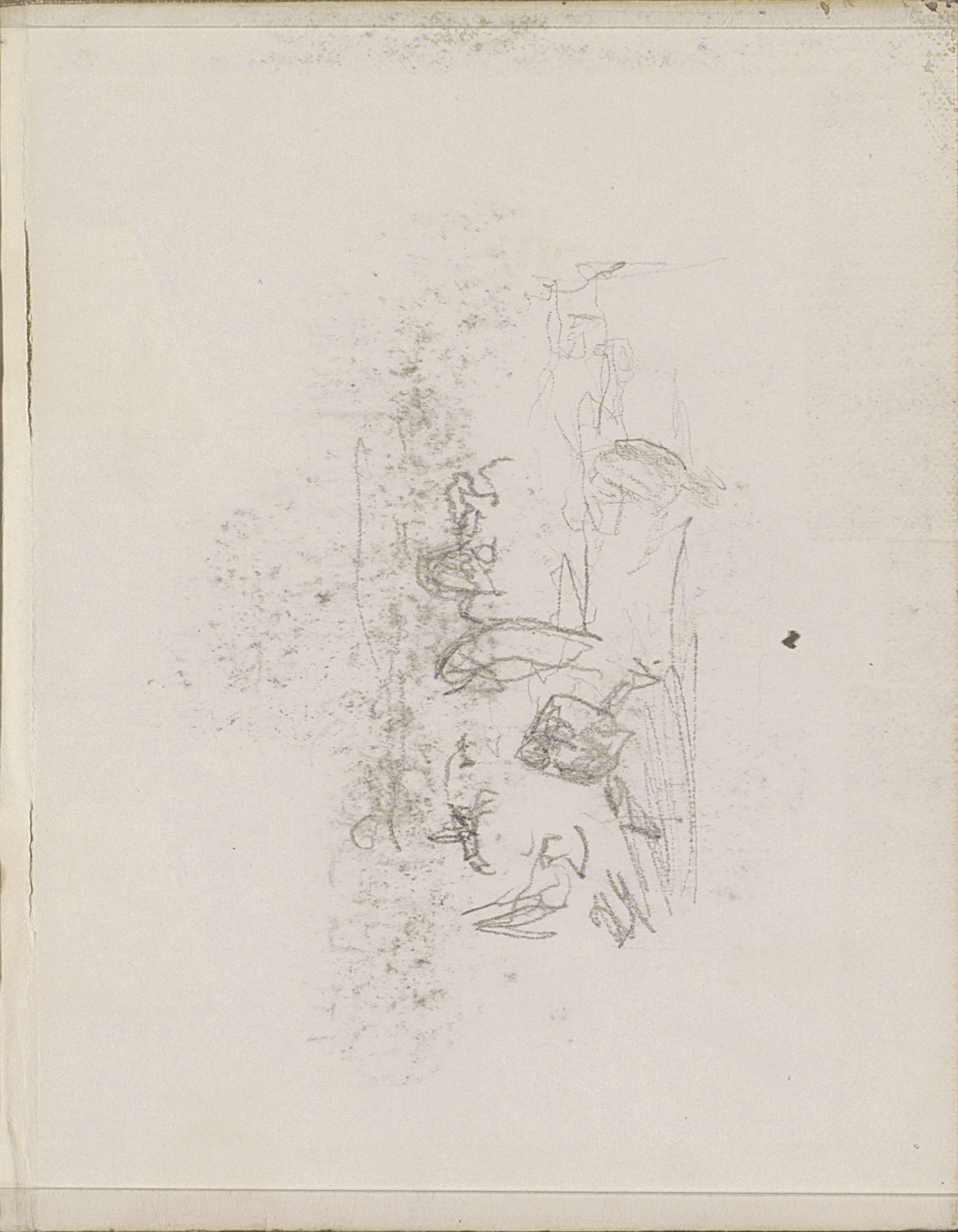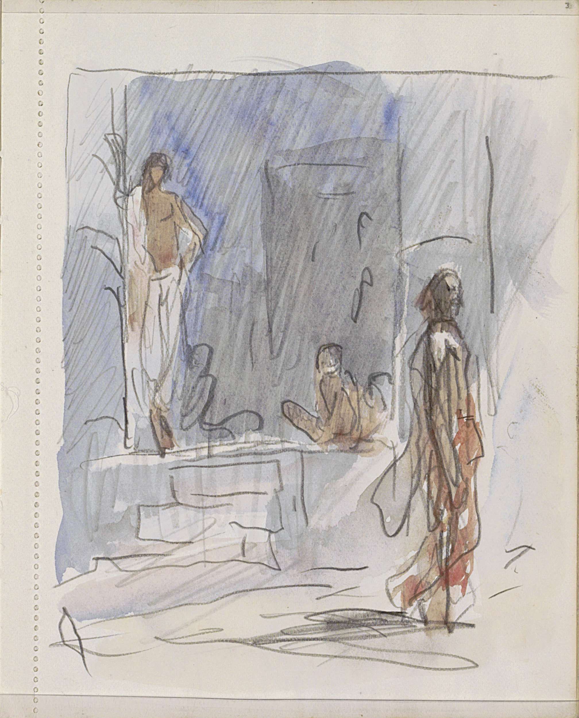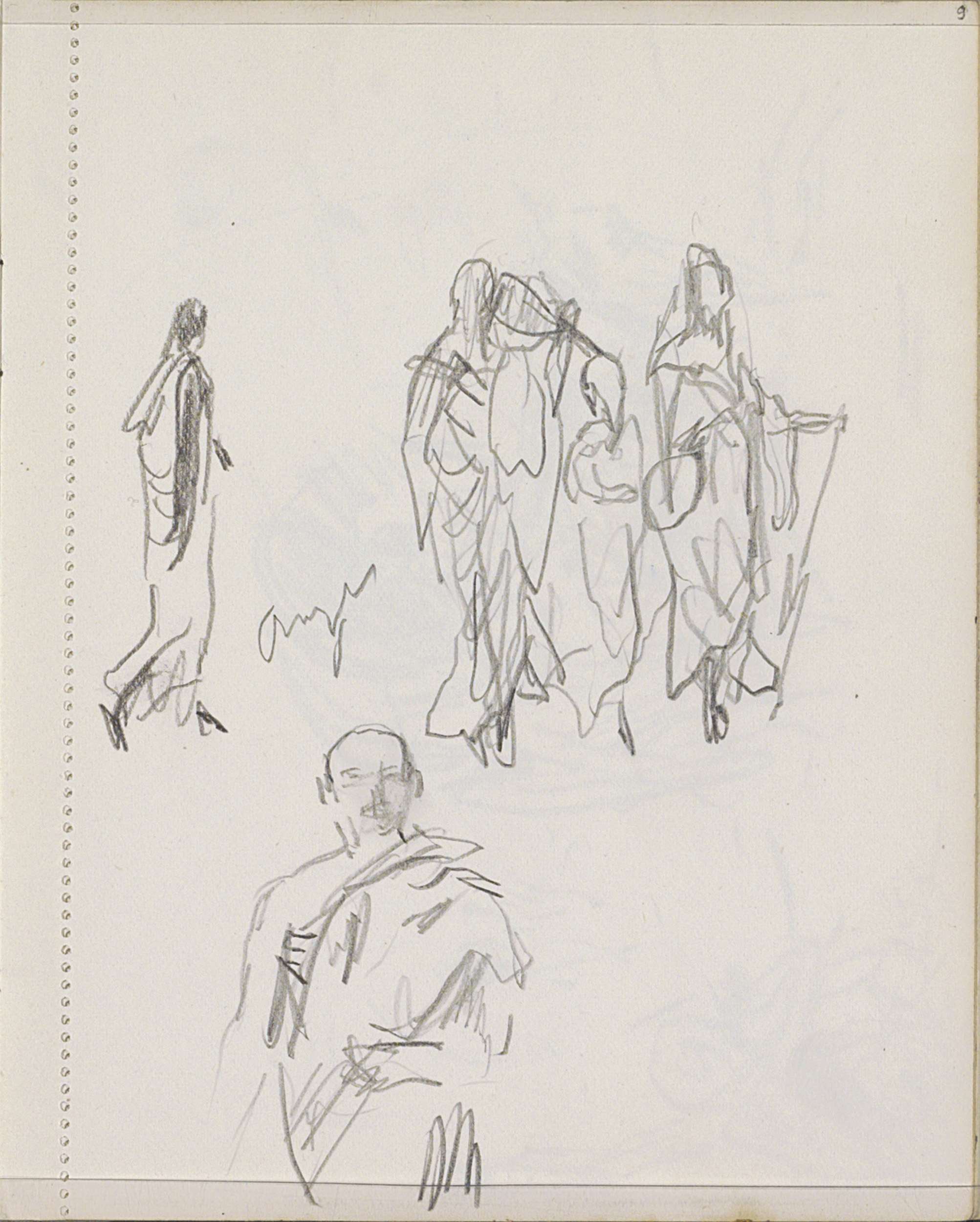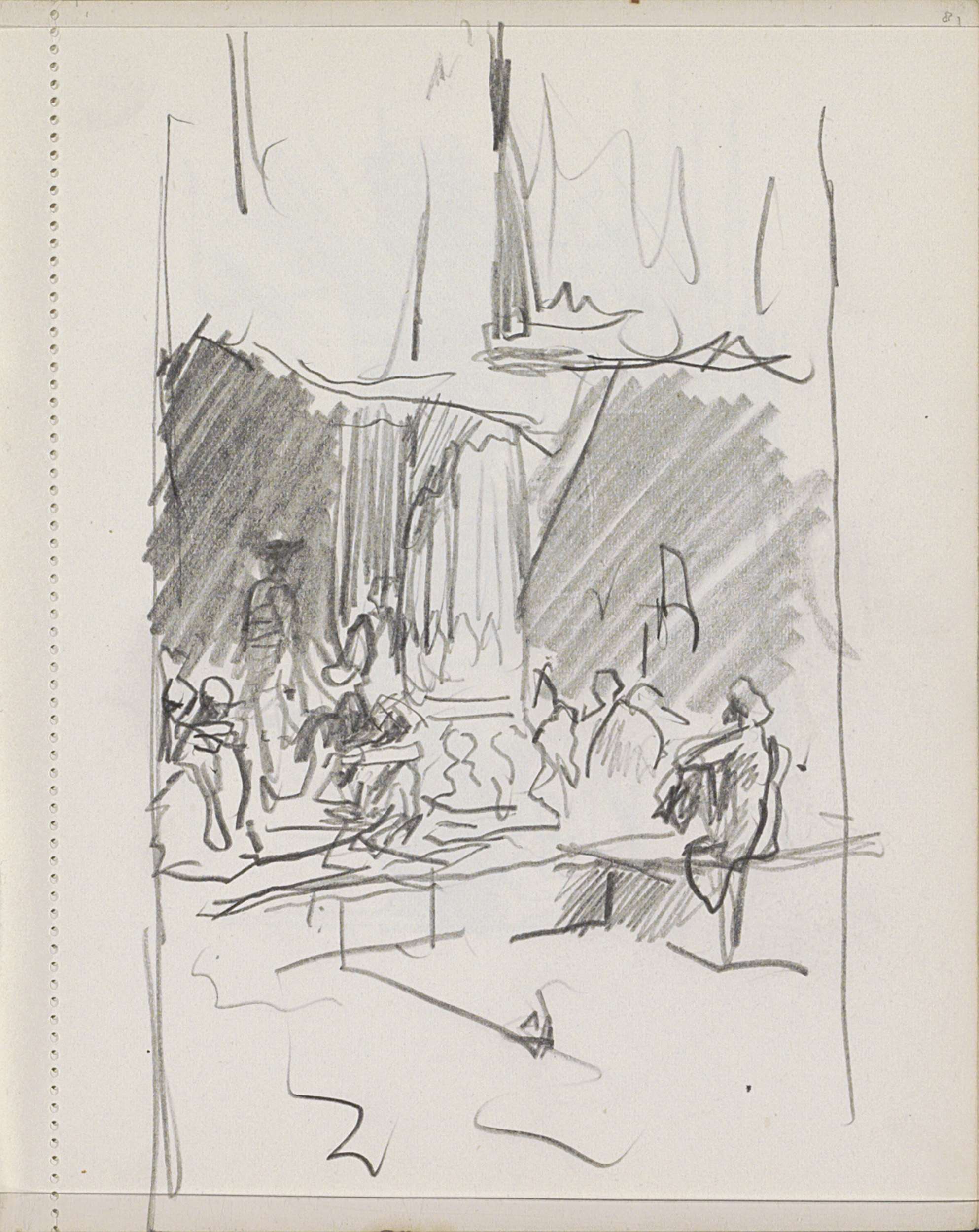 Figuren op de trappen voor een gebouw, mogelijk een ...
