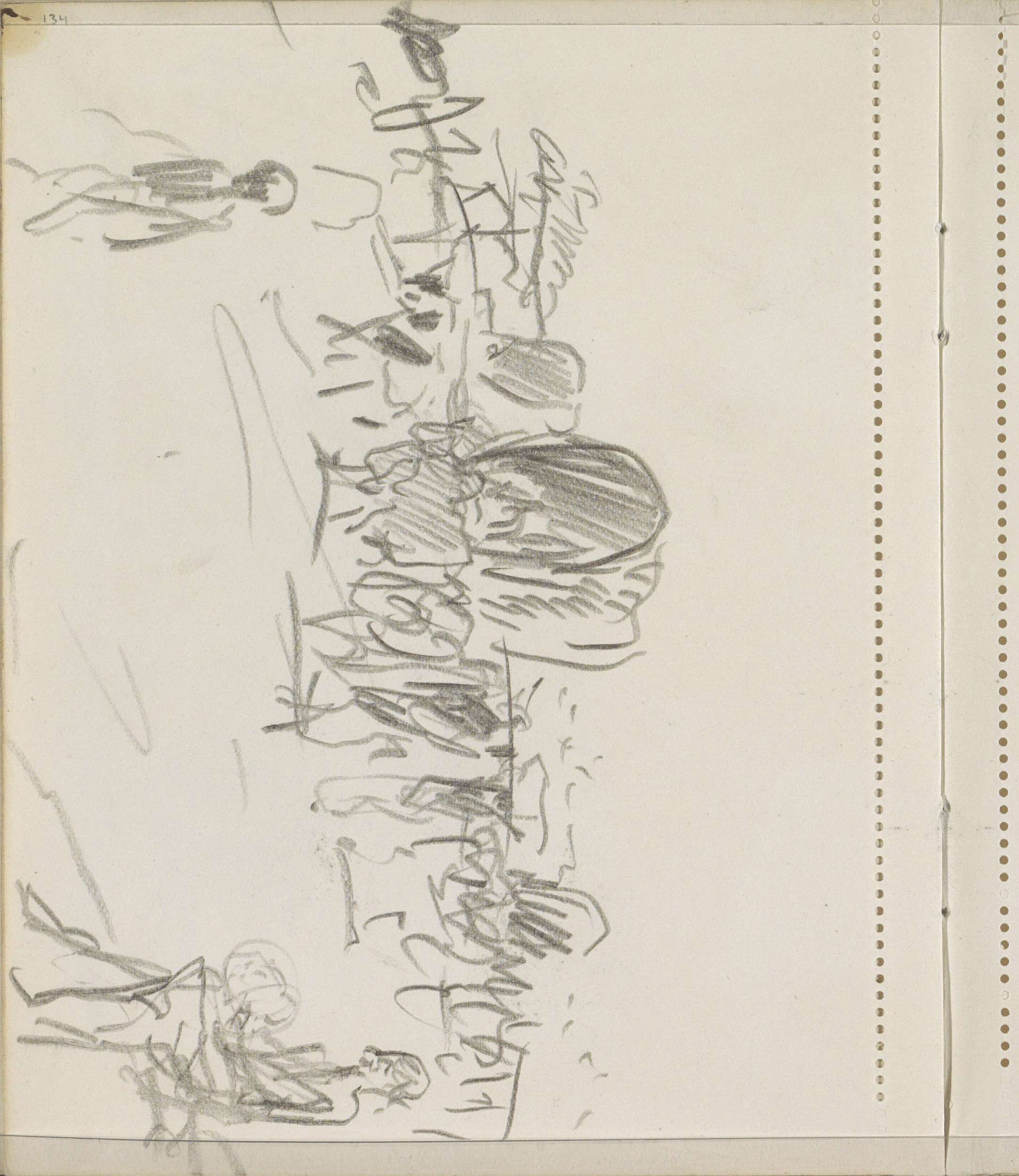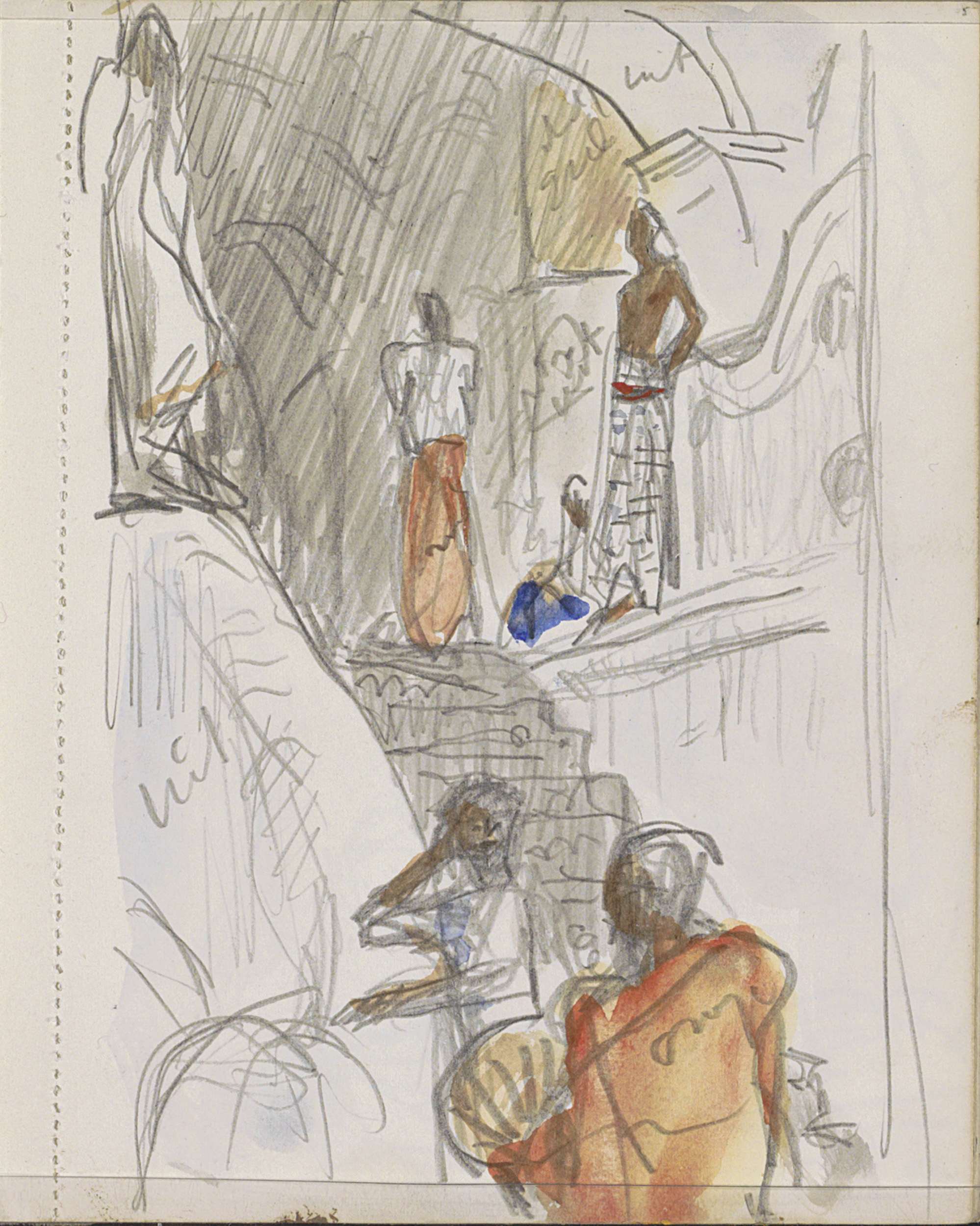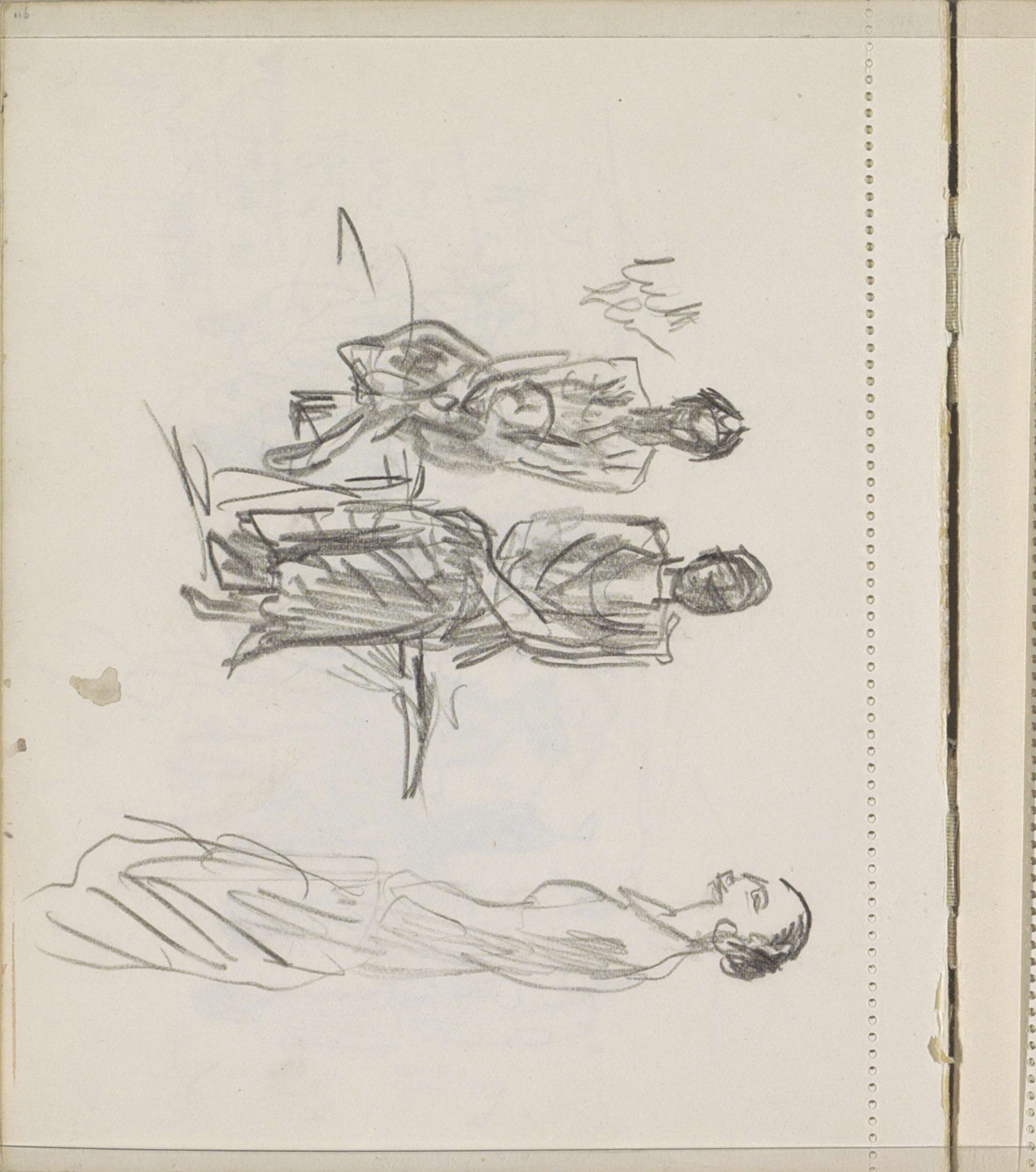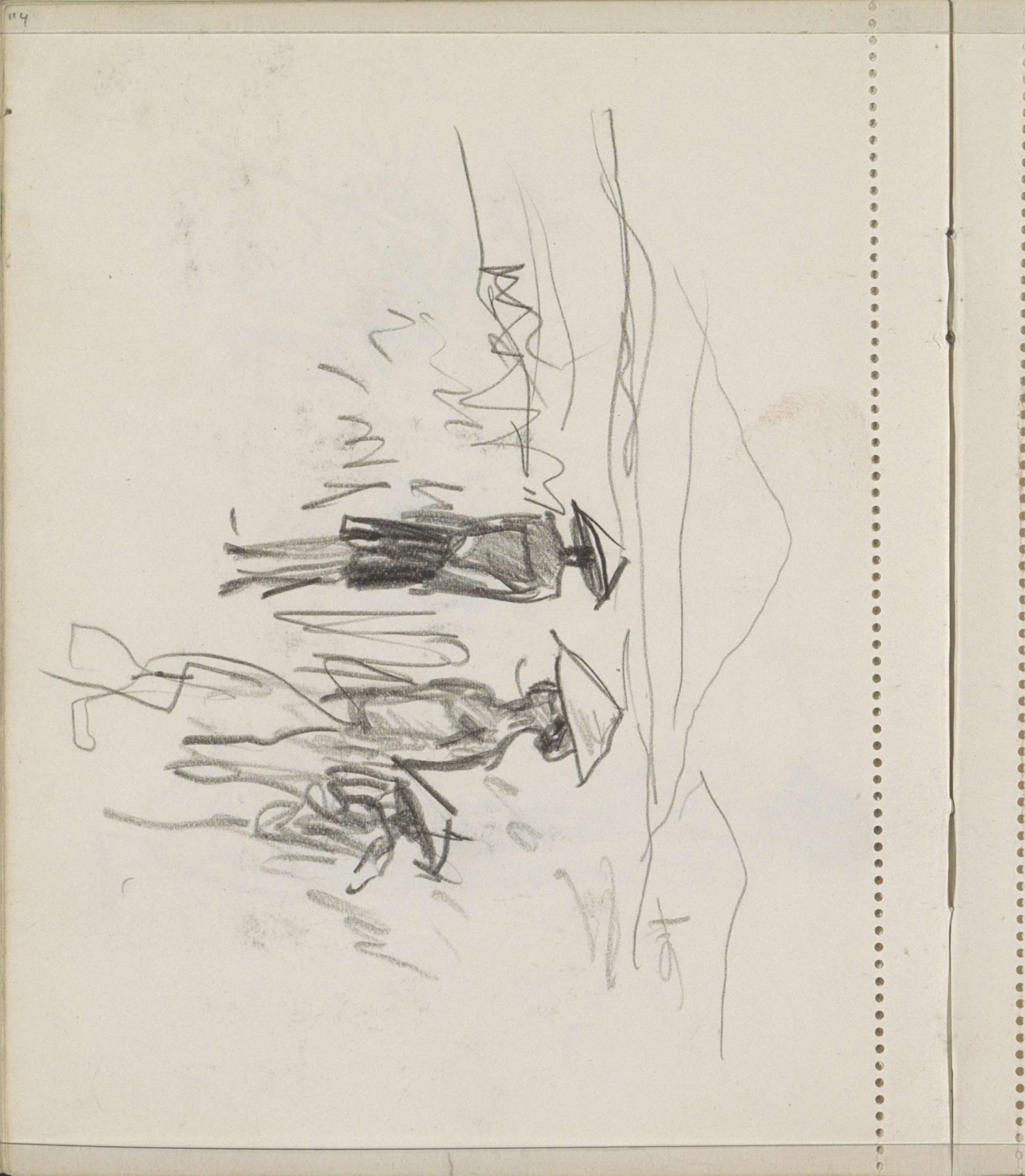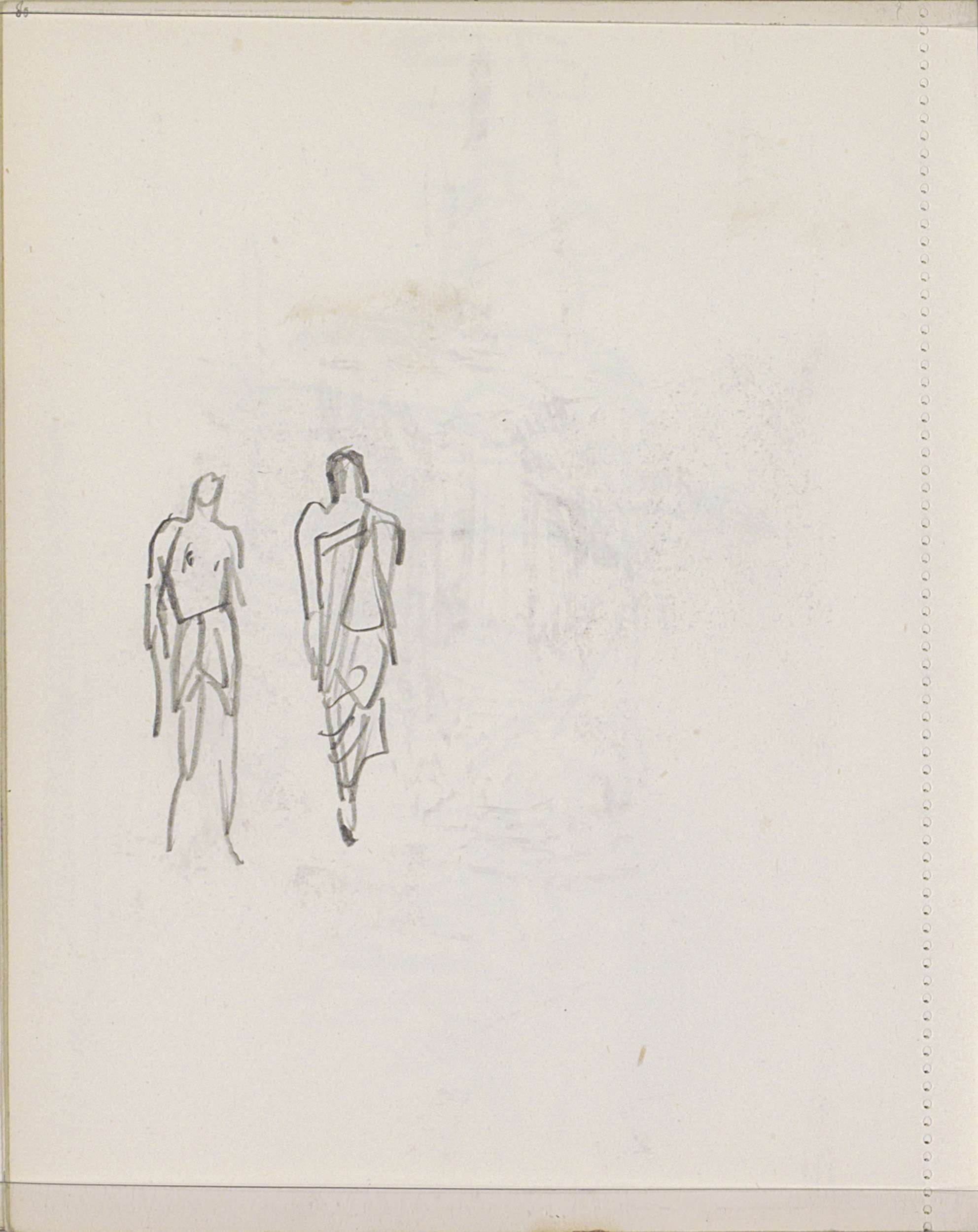 Figuren op de trappen voor een gebouw, mogelijk een ...