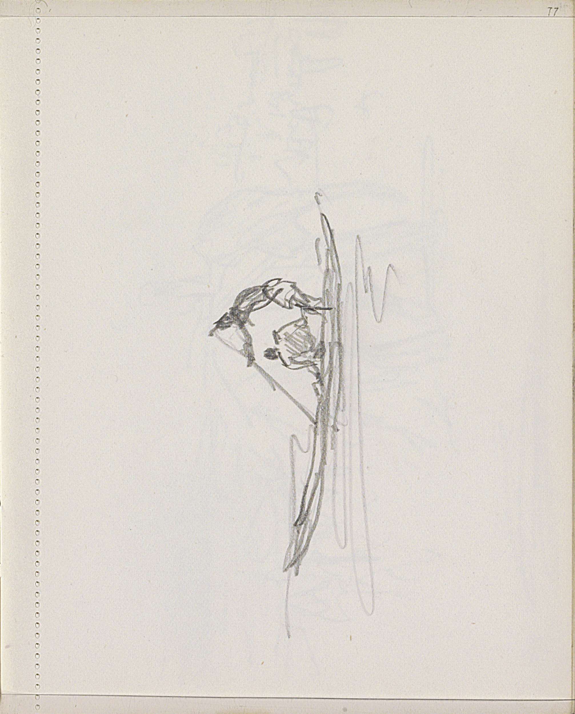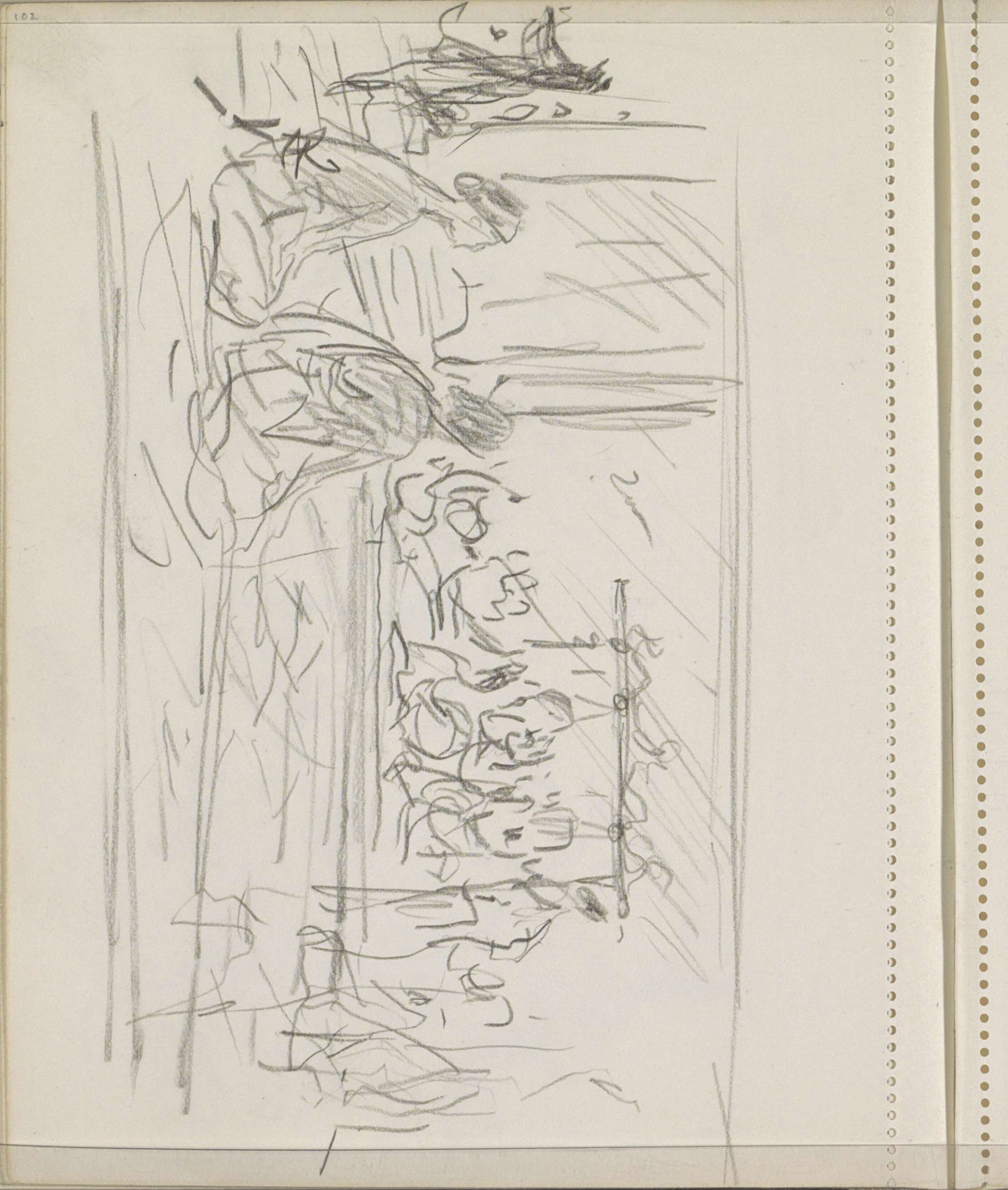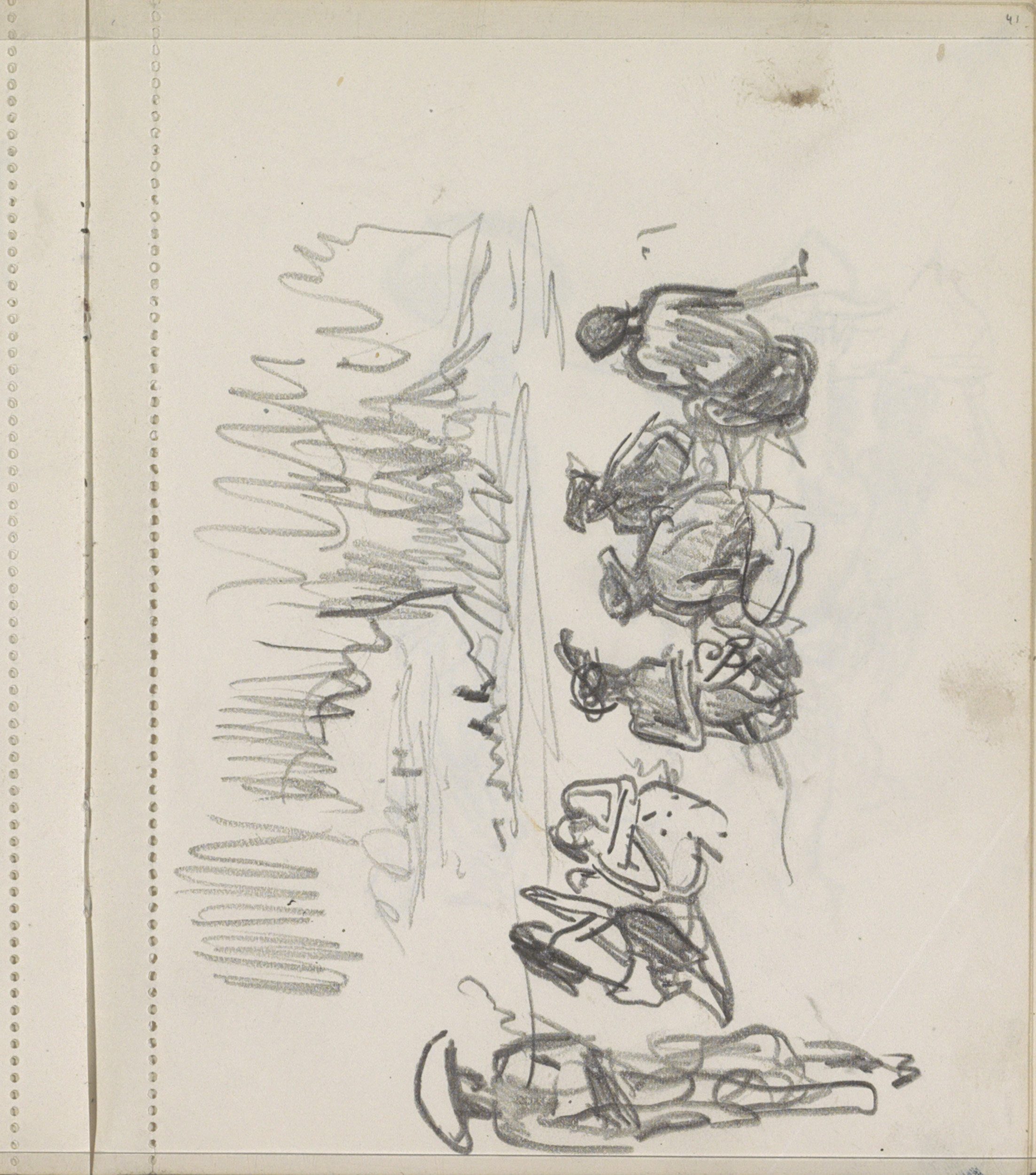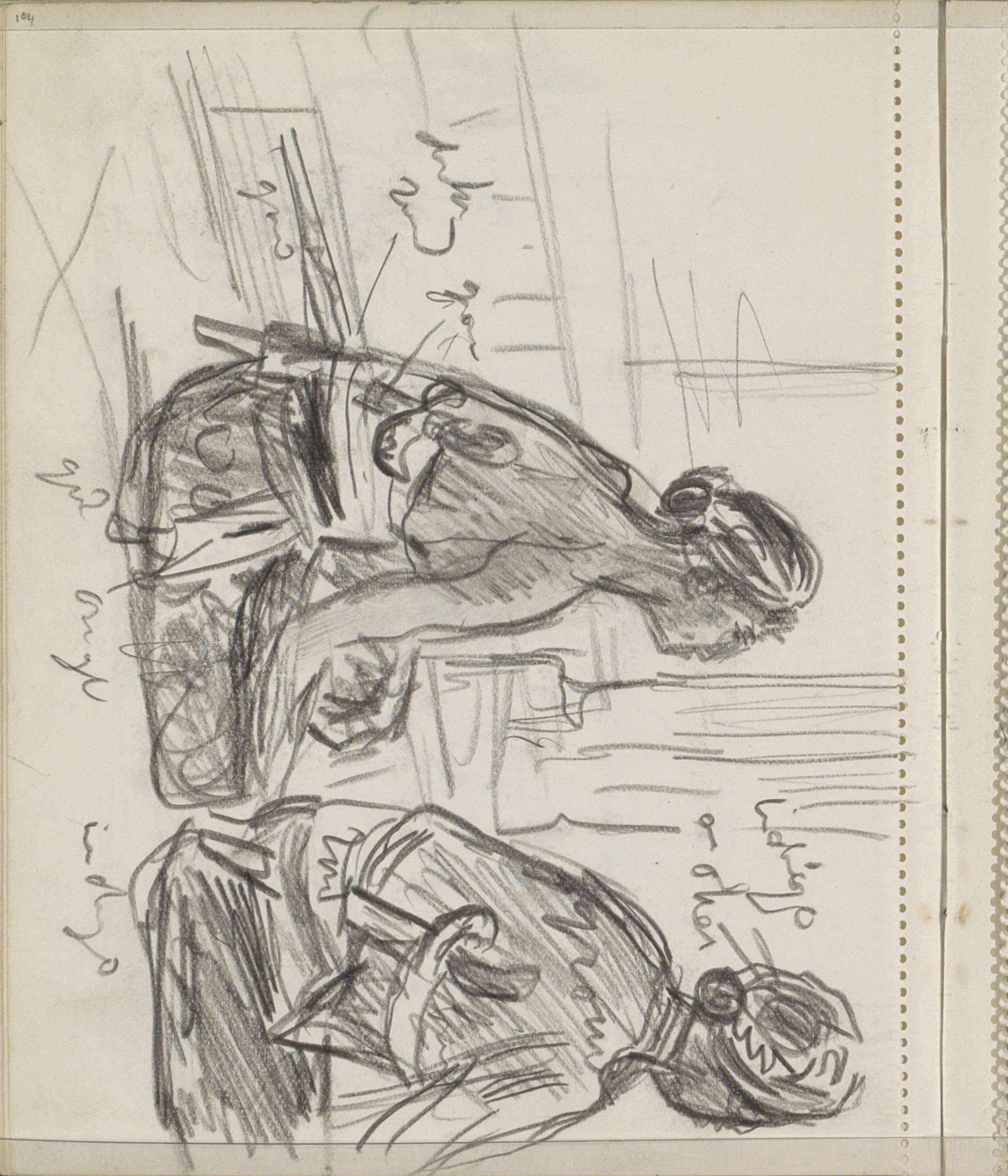Figuren op de trappen voor een gebouw, mogelijk een ...