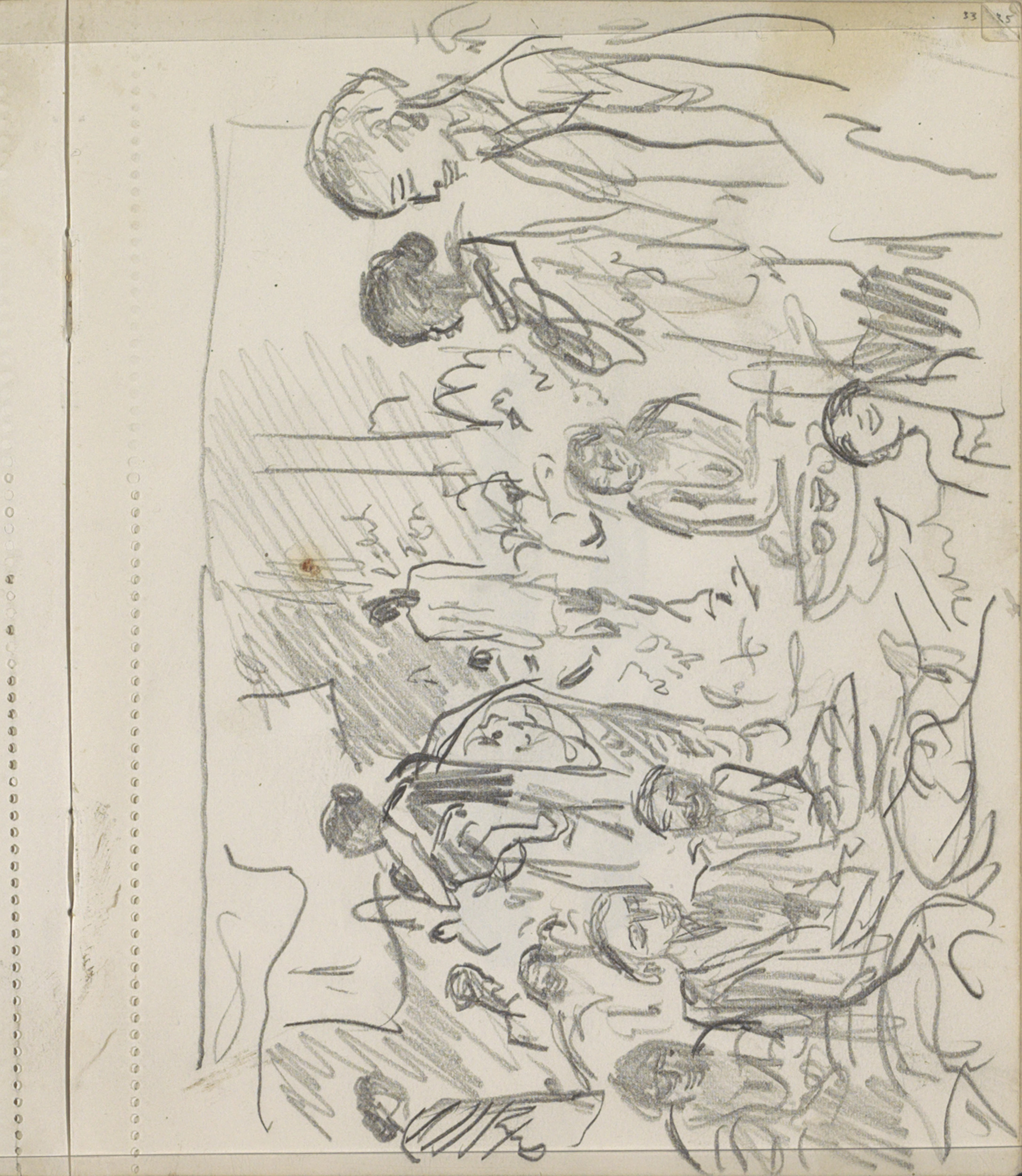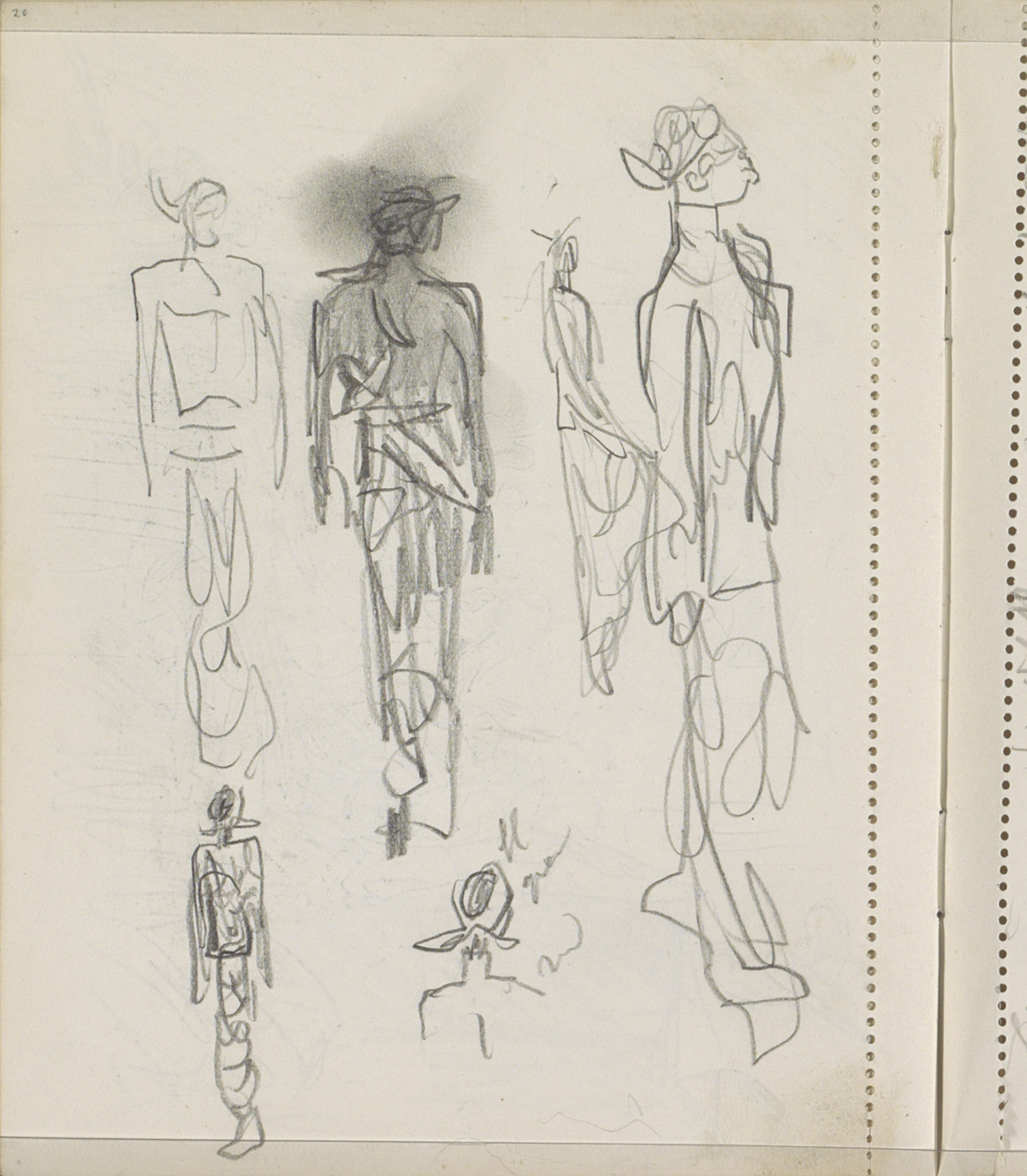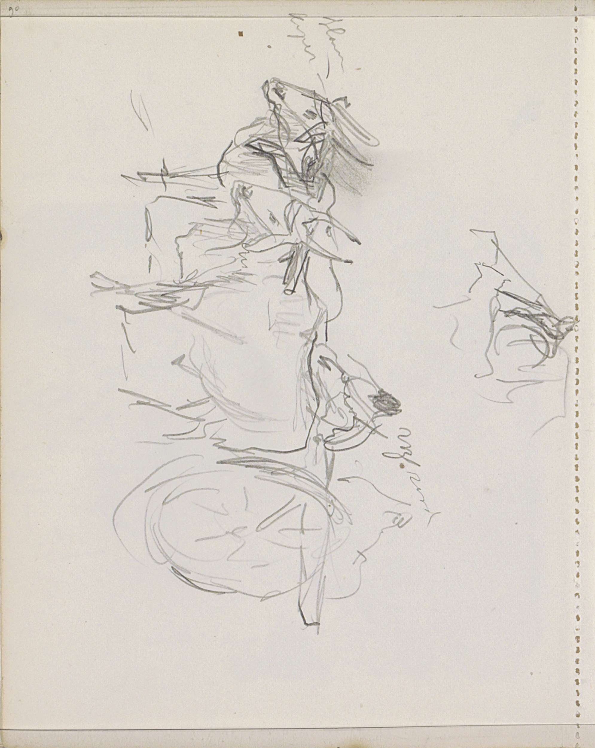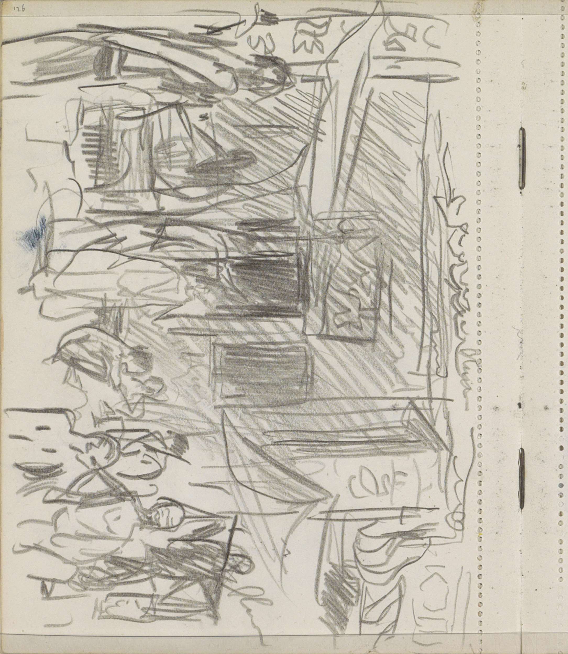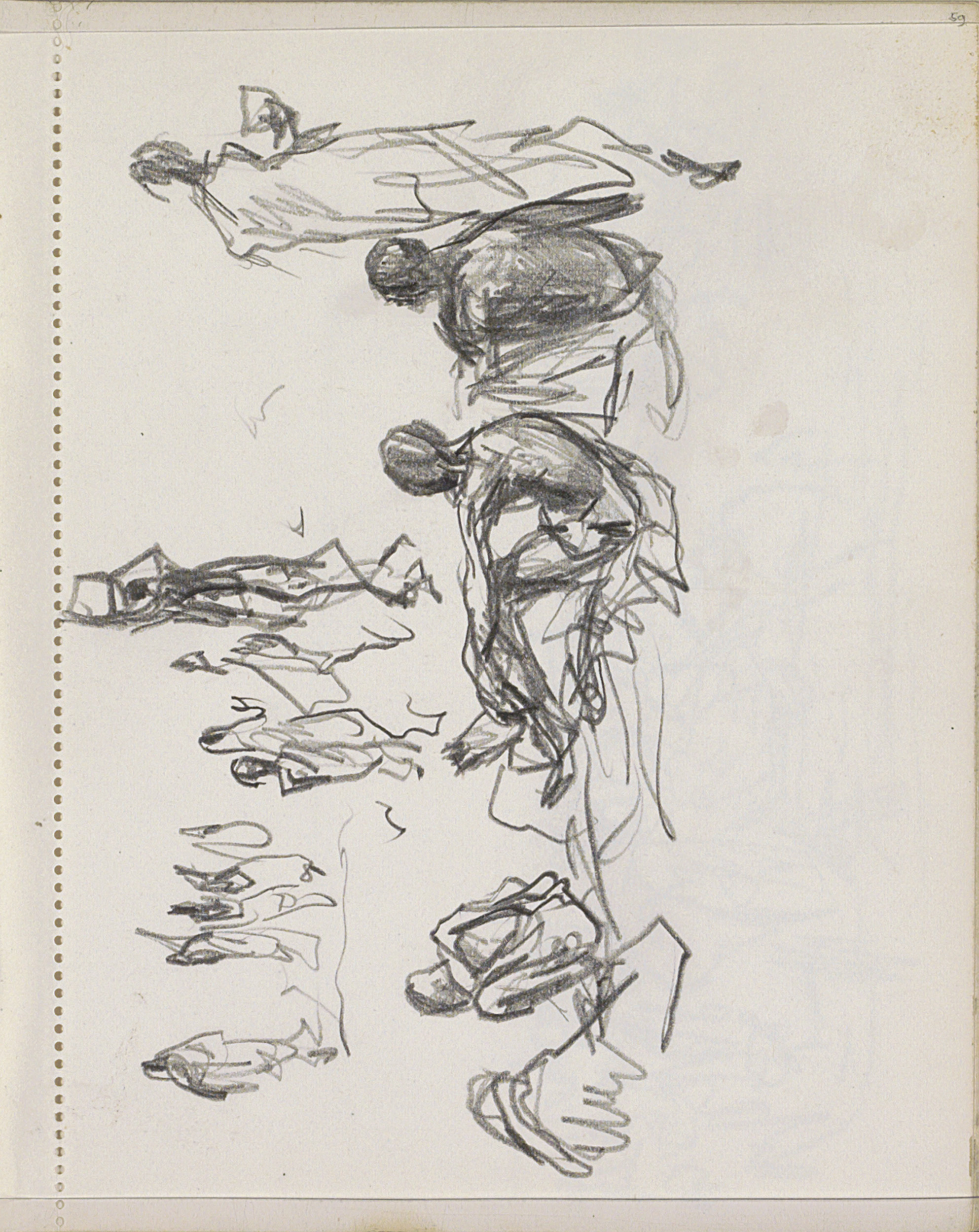 Figuren op de trappen voor een gebouw, mogelijk een ...