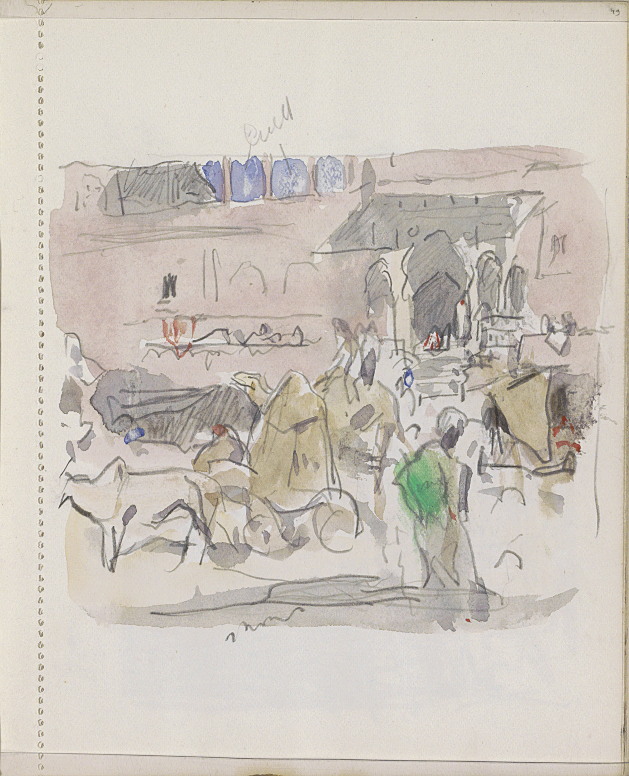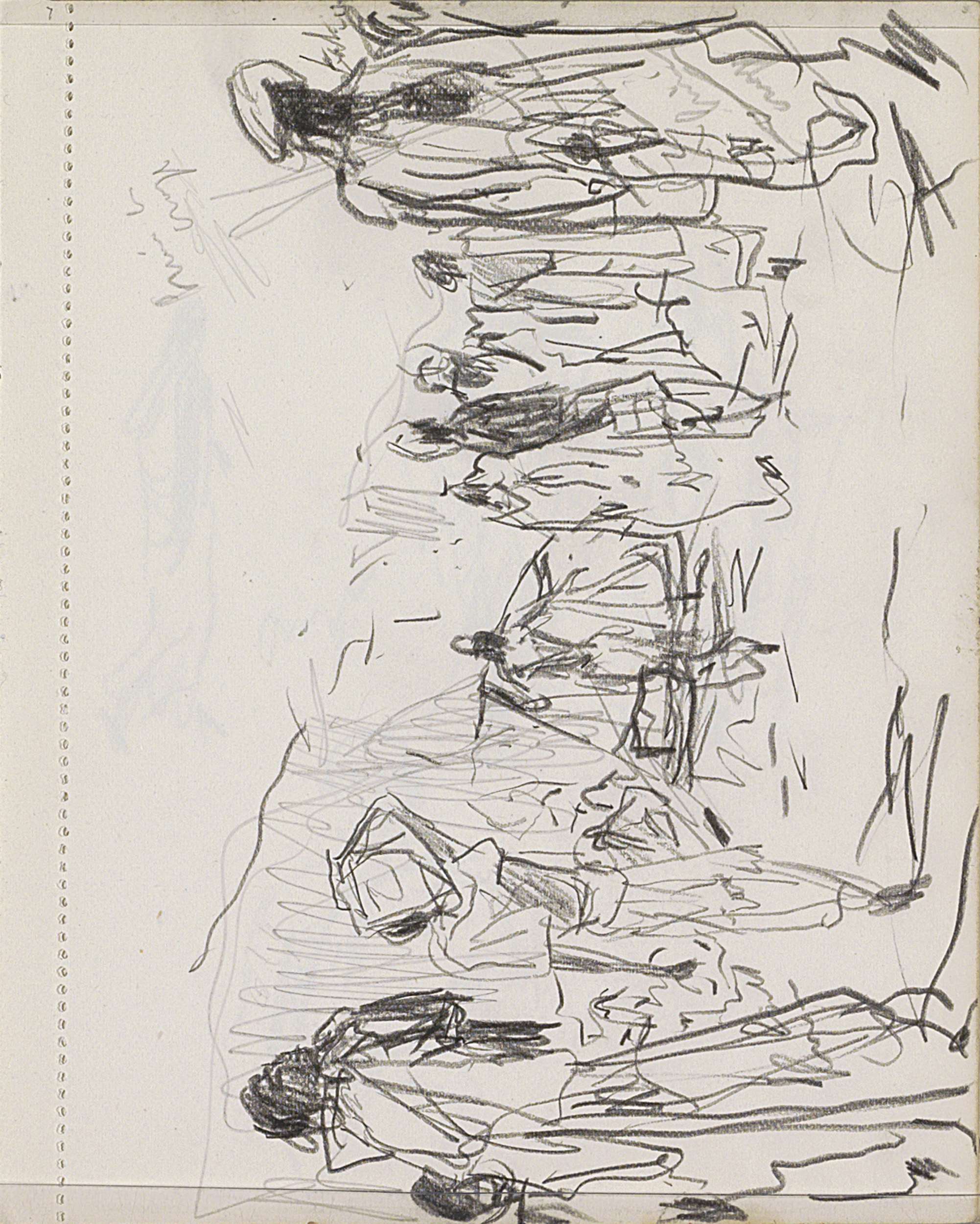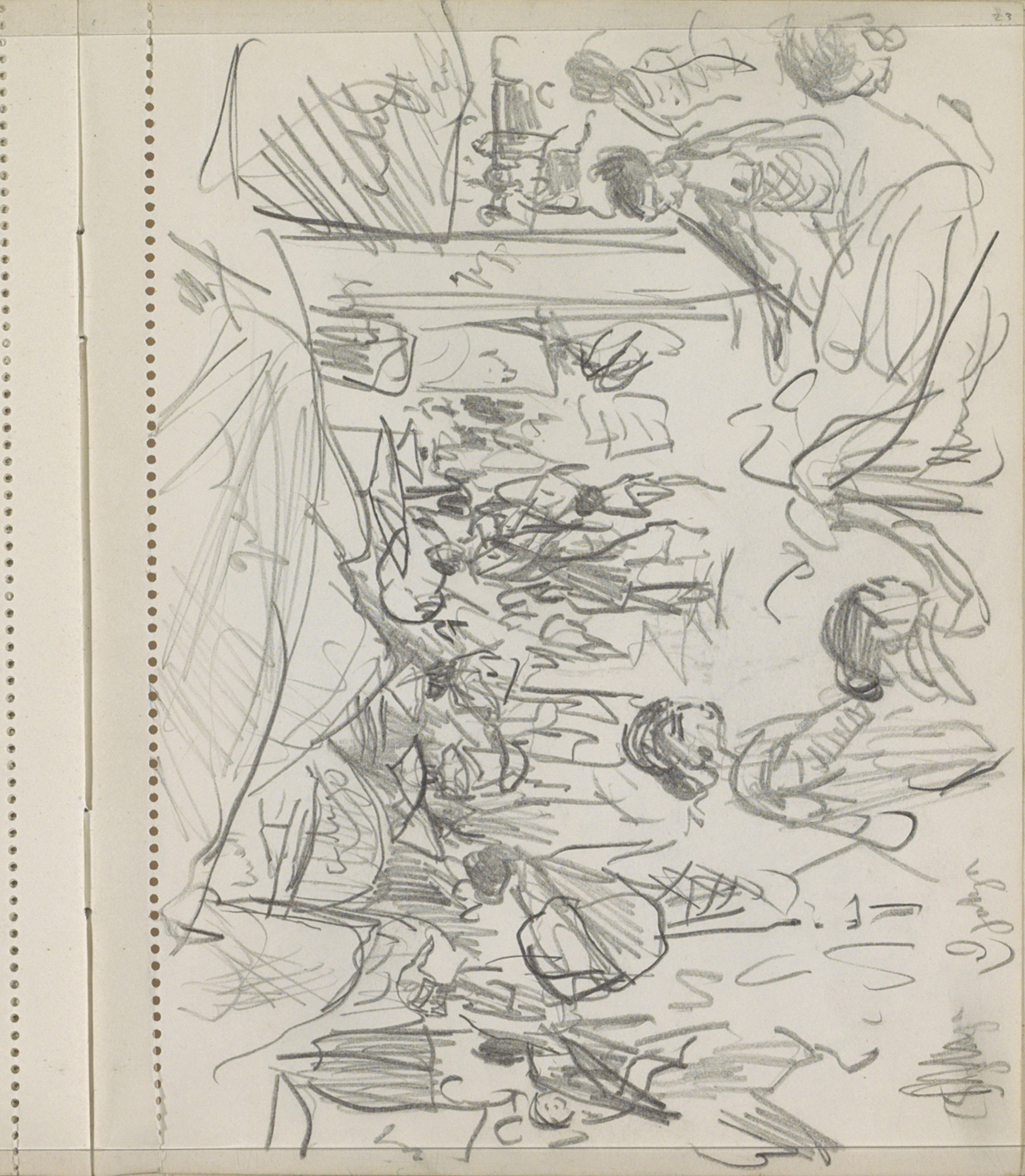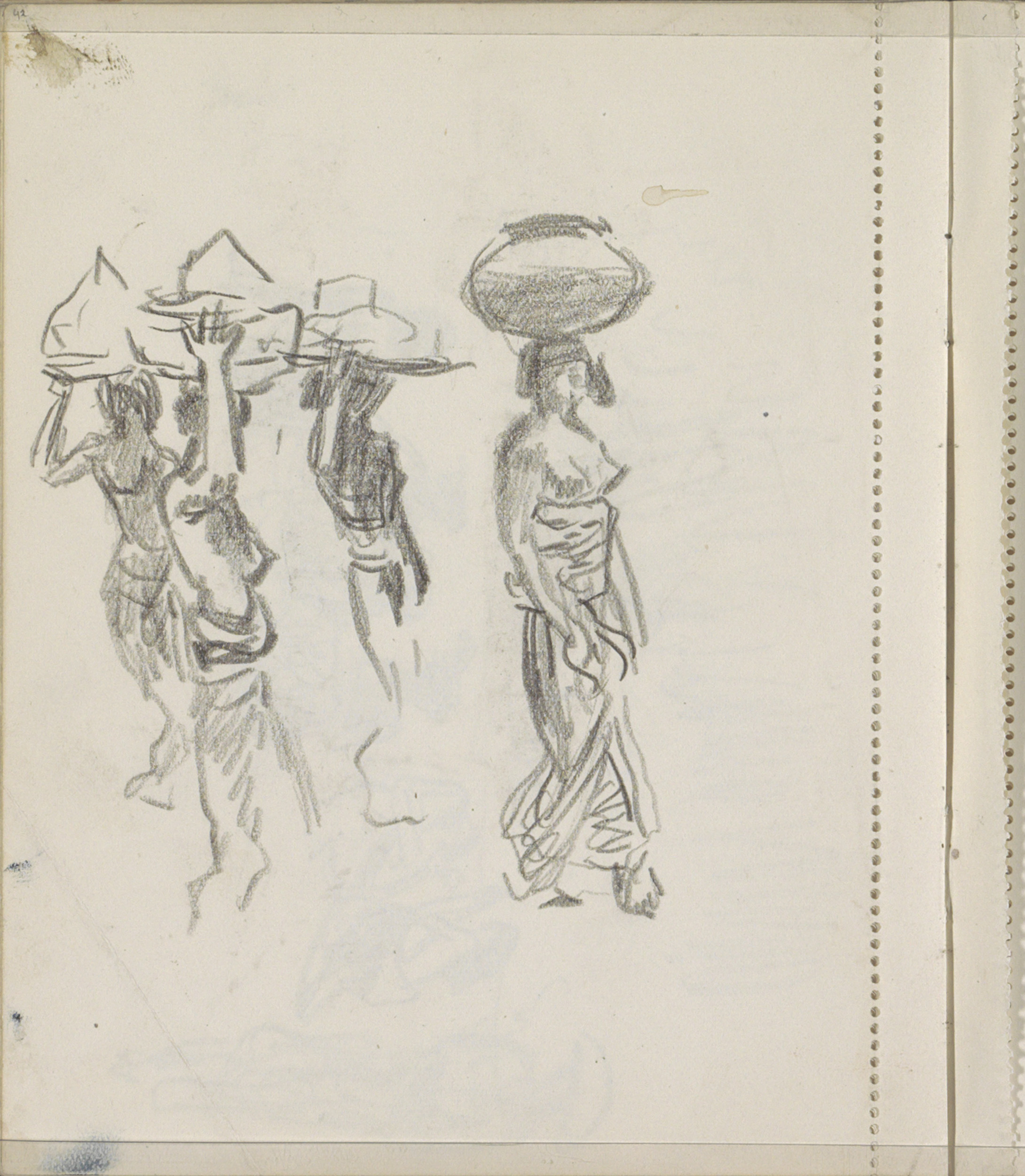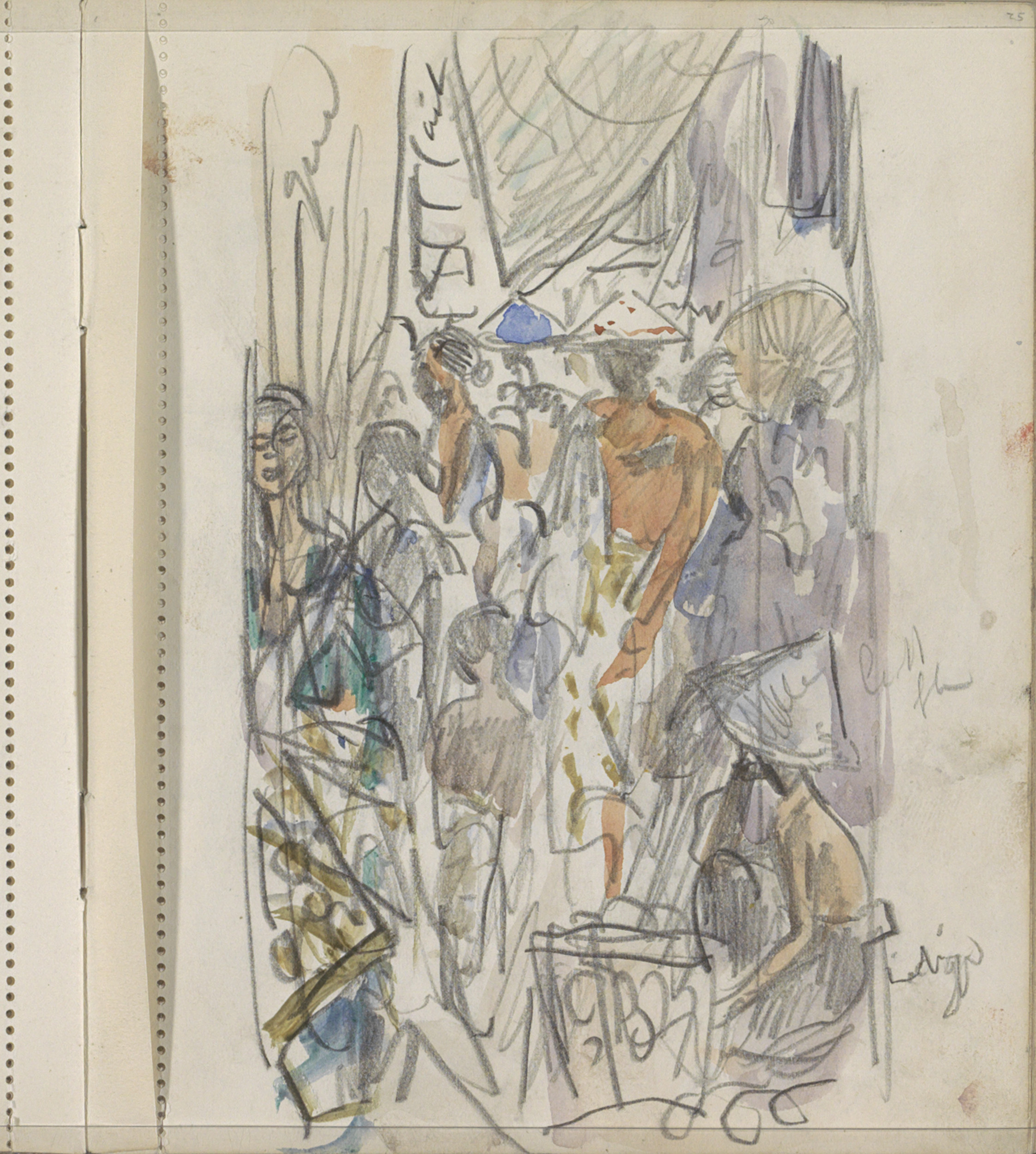 Figuren op de trappen voor een gebouw, mogelijk een ...