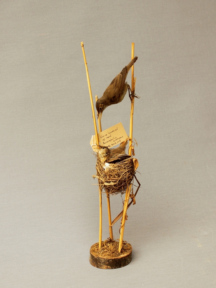 Kleine karekiet + jong op nest