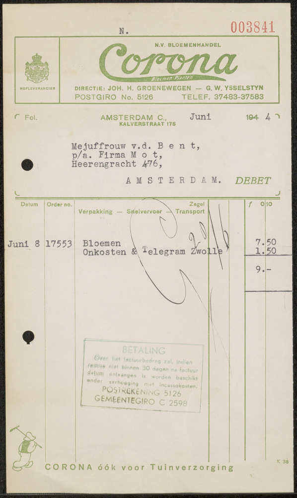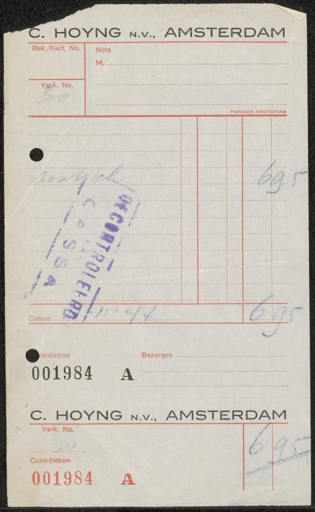 afleverbon fa. C Hoyng n.v. Amsterdam
