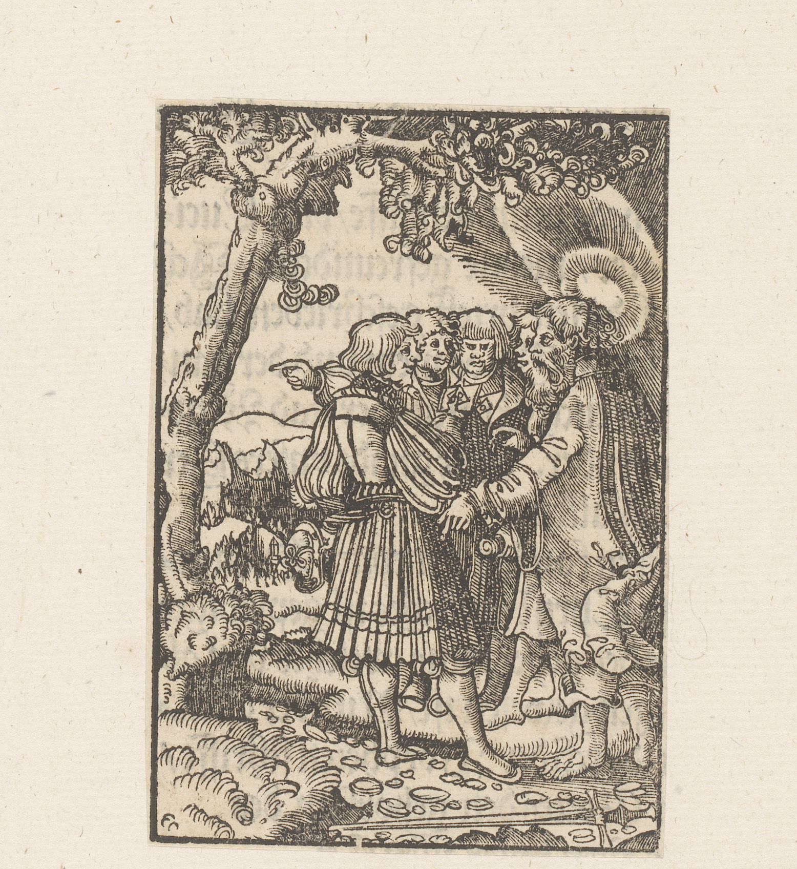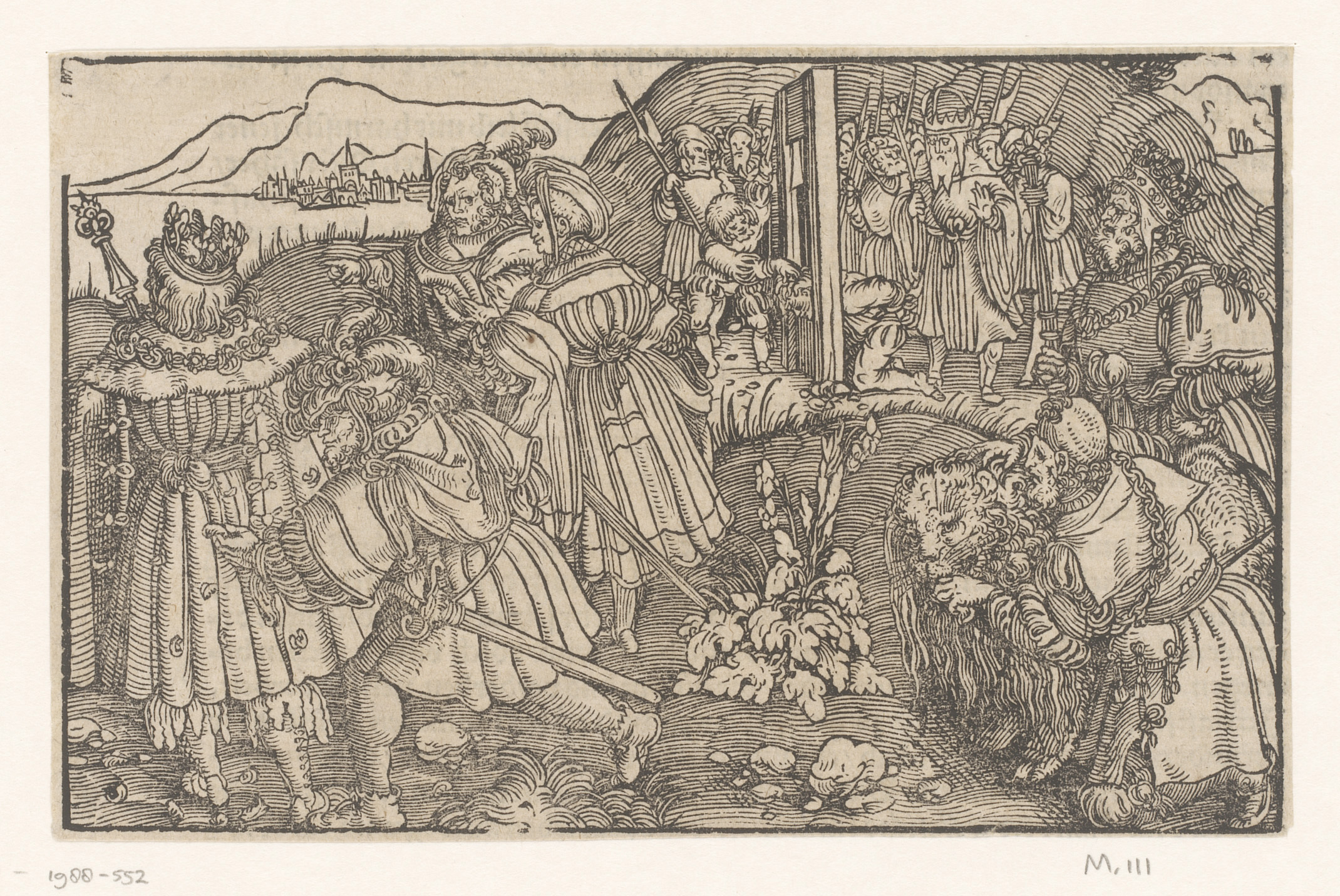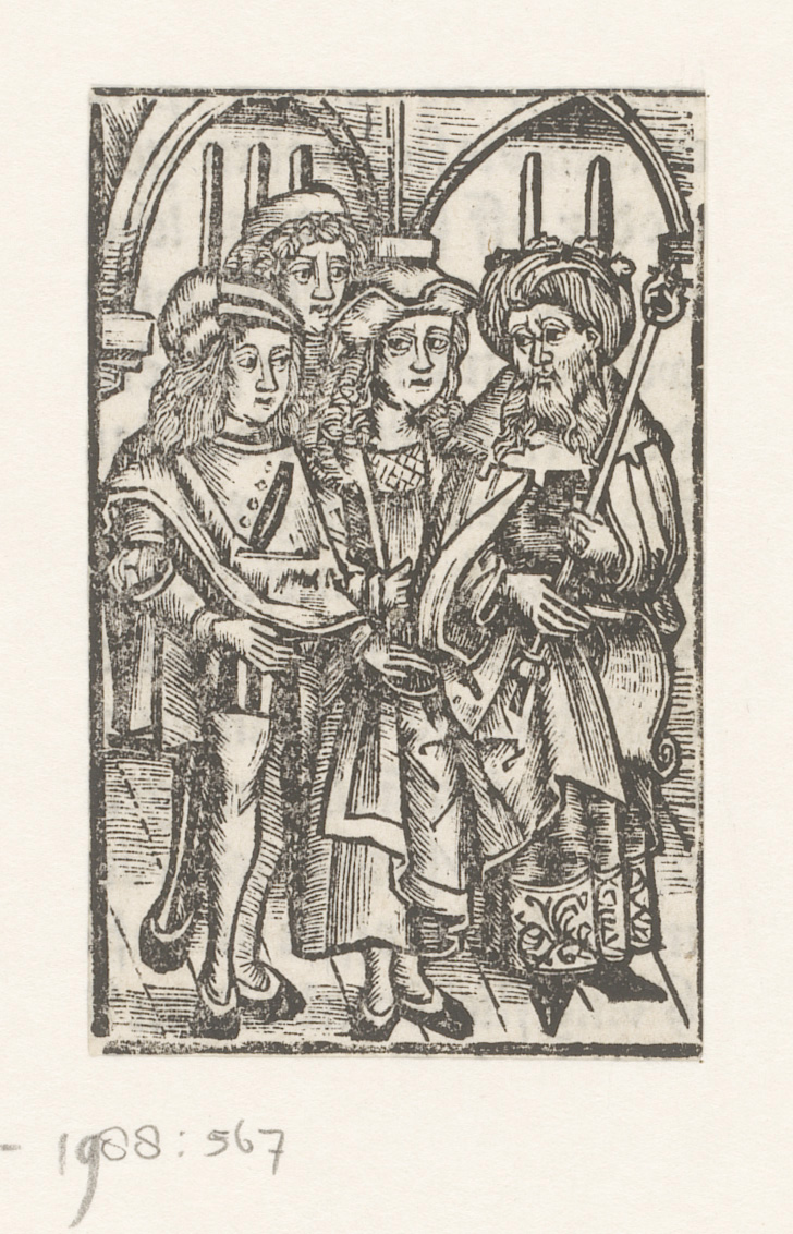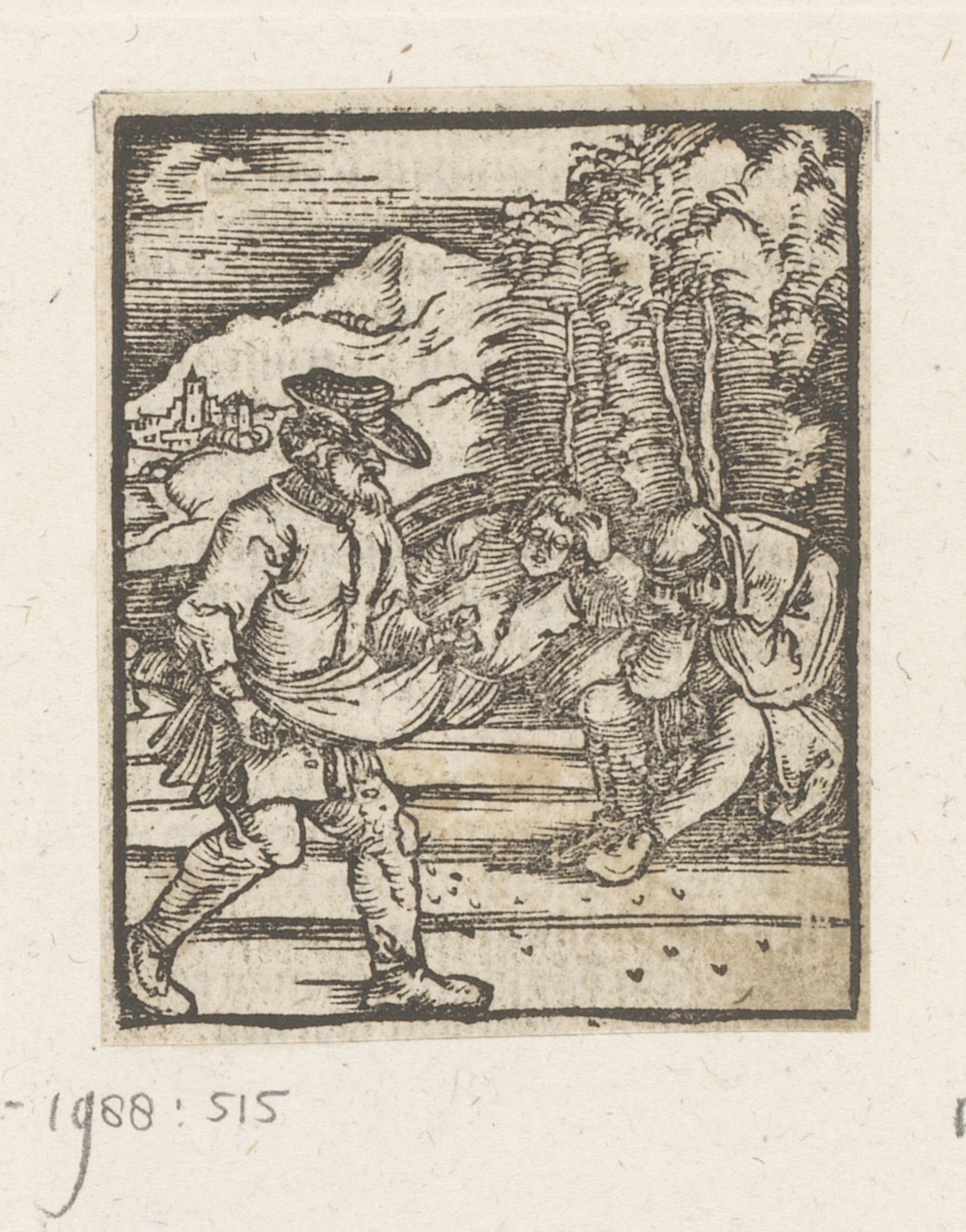 Struikrover vermoordt een pelgrim terwijl rechts een...
