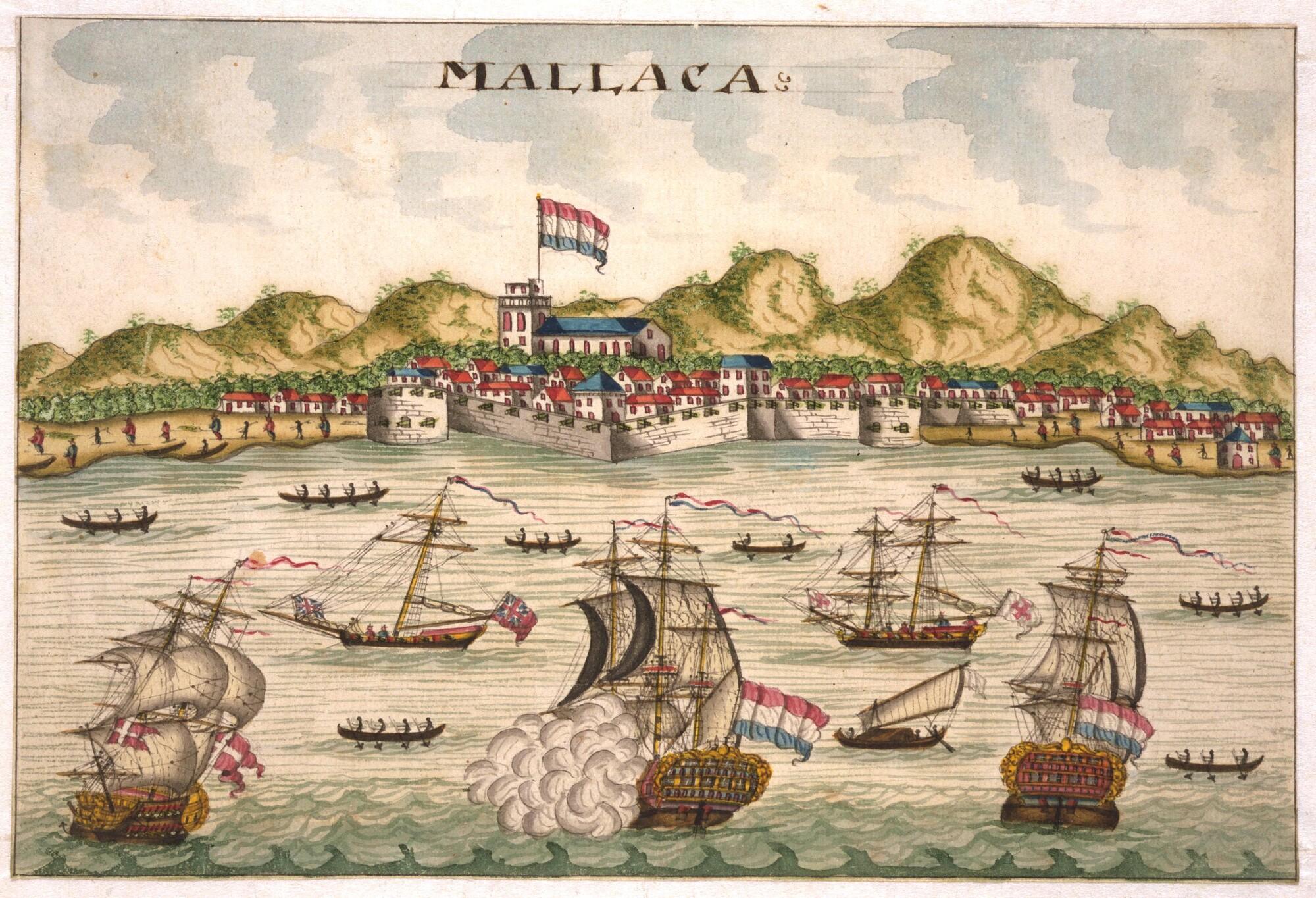 Scheepvaart op rede van Malakka, ca. 1750