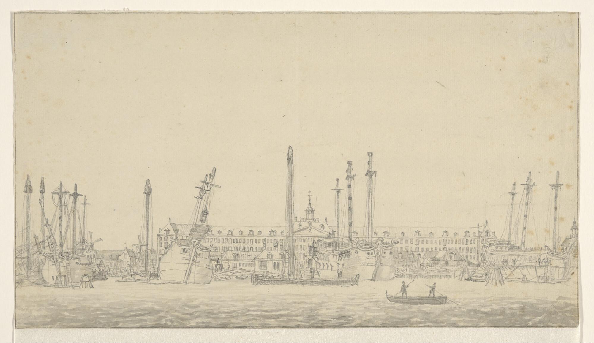 Binnenschepen en oorlogsschepen op een rede