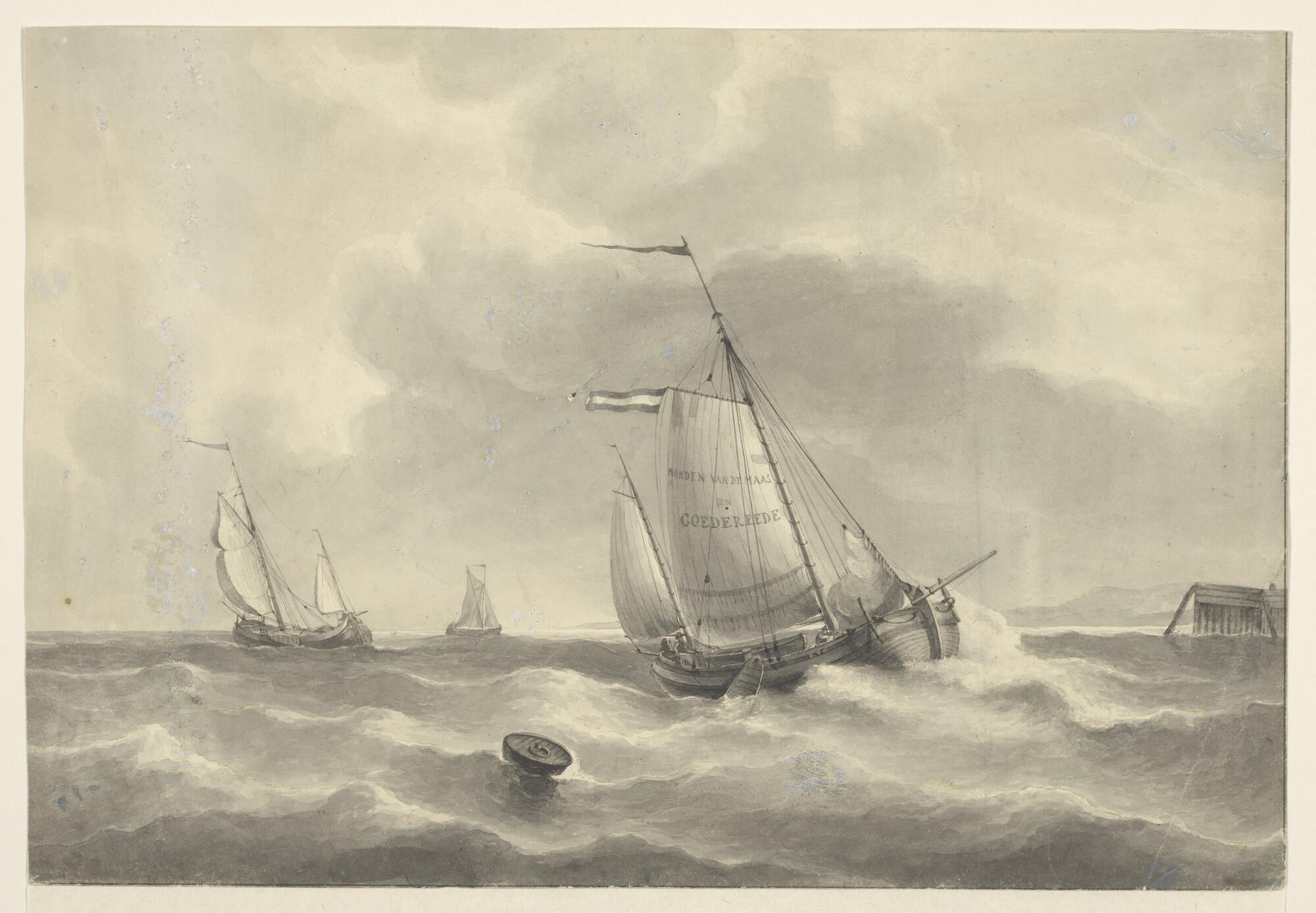 Een binnenschip onder zeil en oorlogsschepen op een ...
