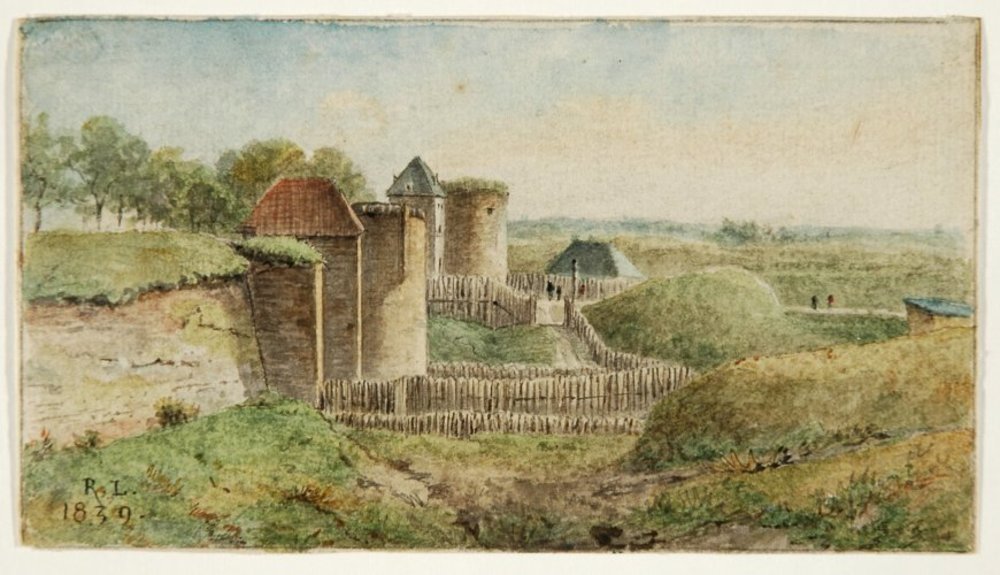 Gezicht op de Nijmeegse stadsmuur en droge gracht me...
