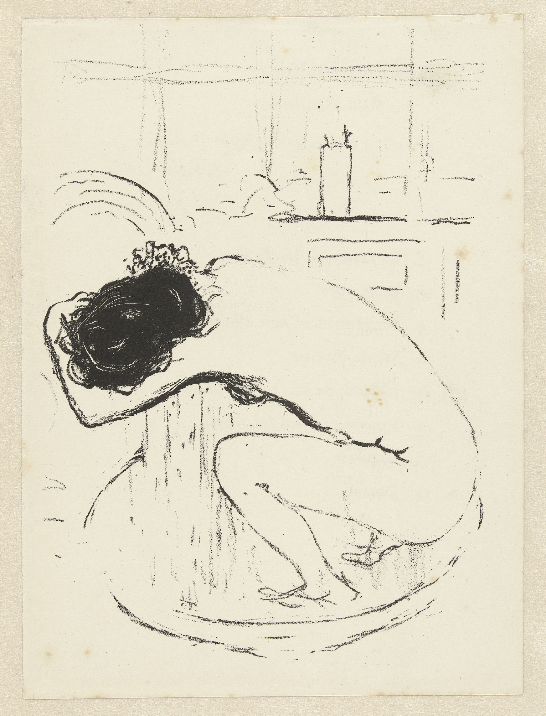 Naakte vrouw zit gehurkt in tobbe en wast zich