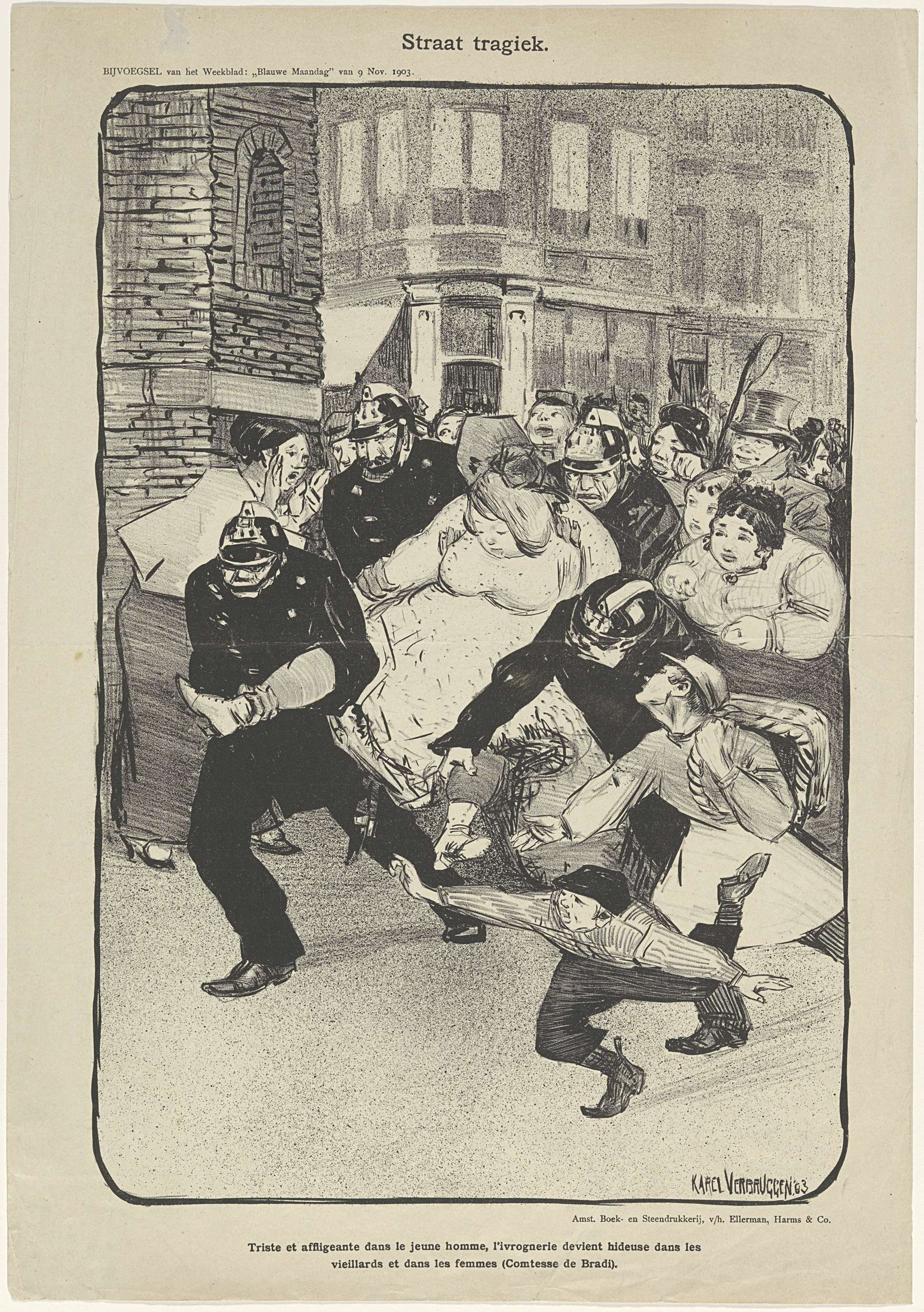 Man en zijn bediende lopen hooghartig langs bedelend...