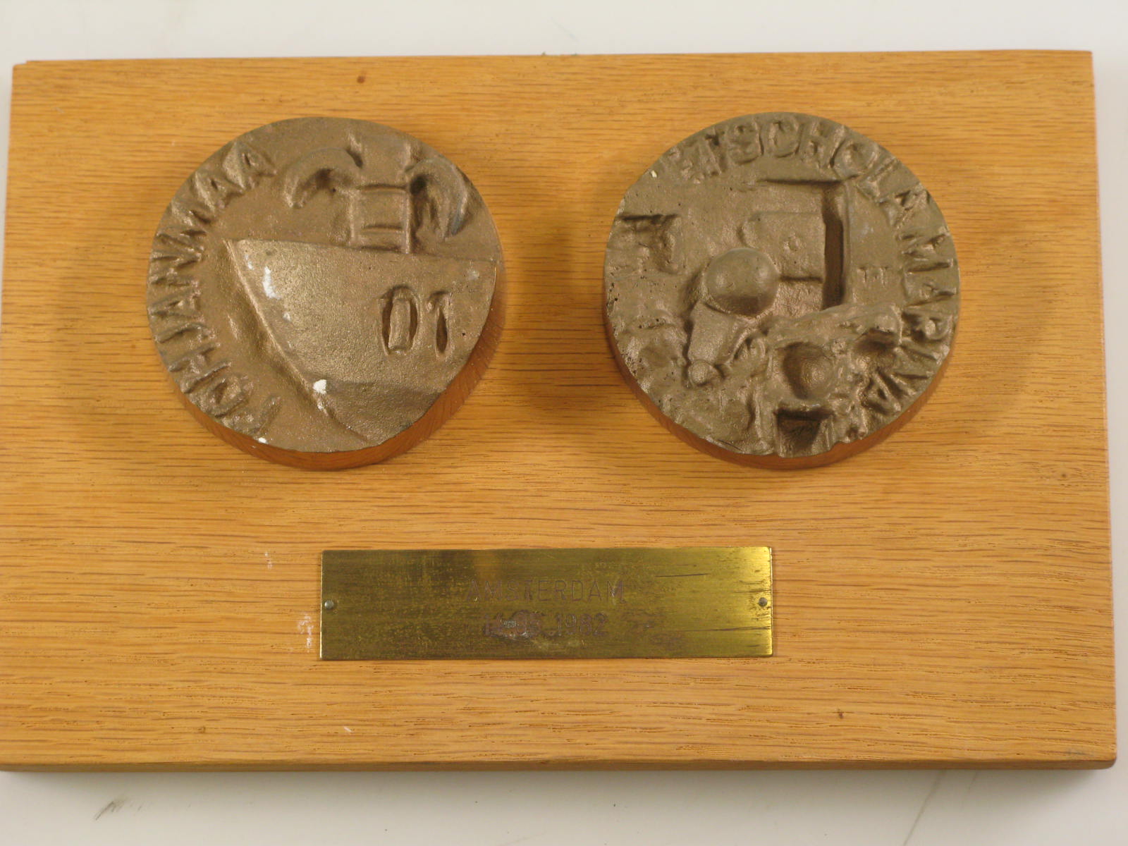 Plaquette met twee penningen 'Schola Marina' uit 1982