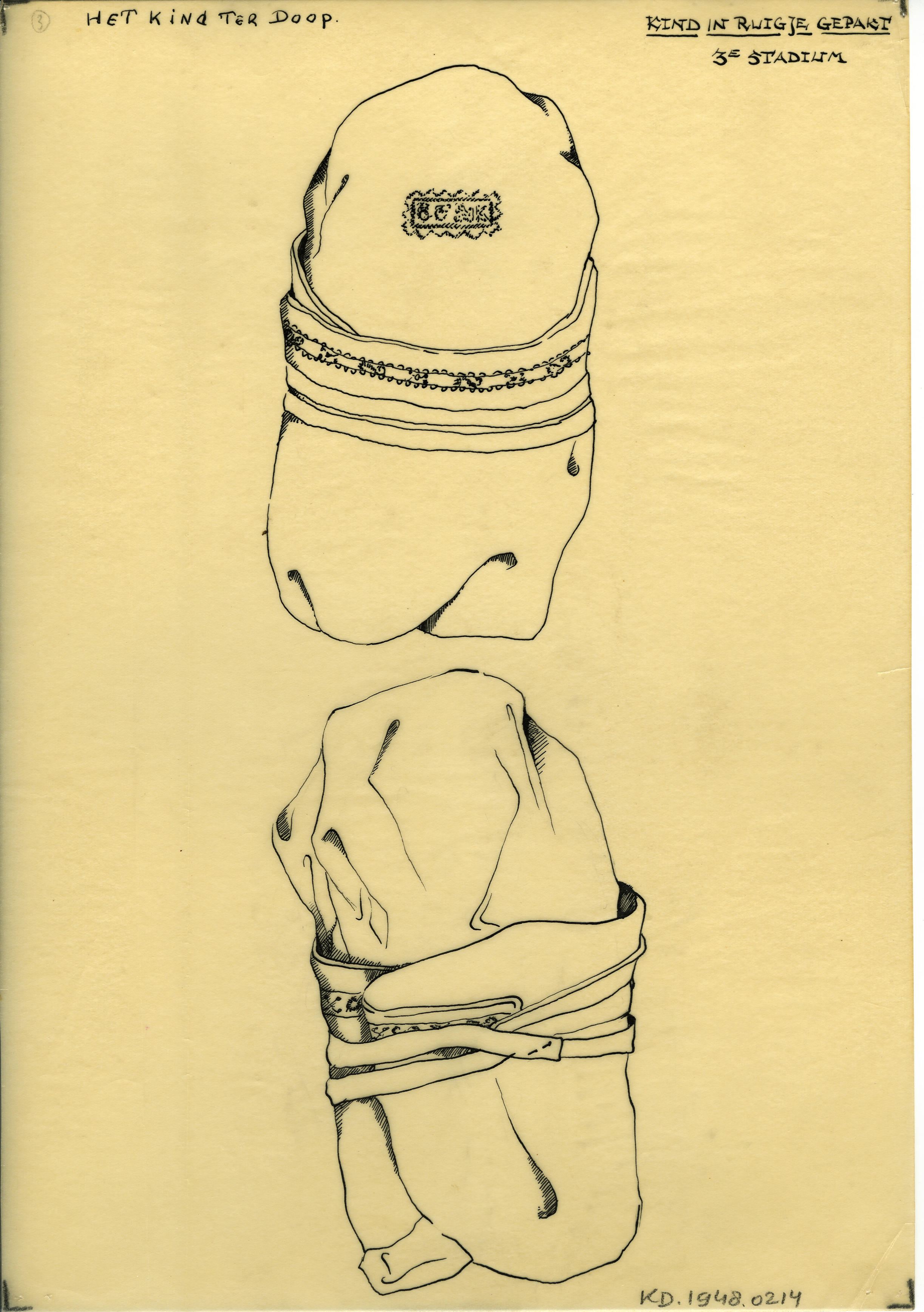 Tekening van twee stadia van het kindje in de baker,...
