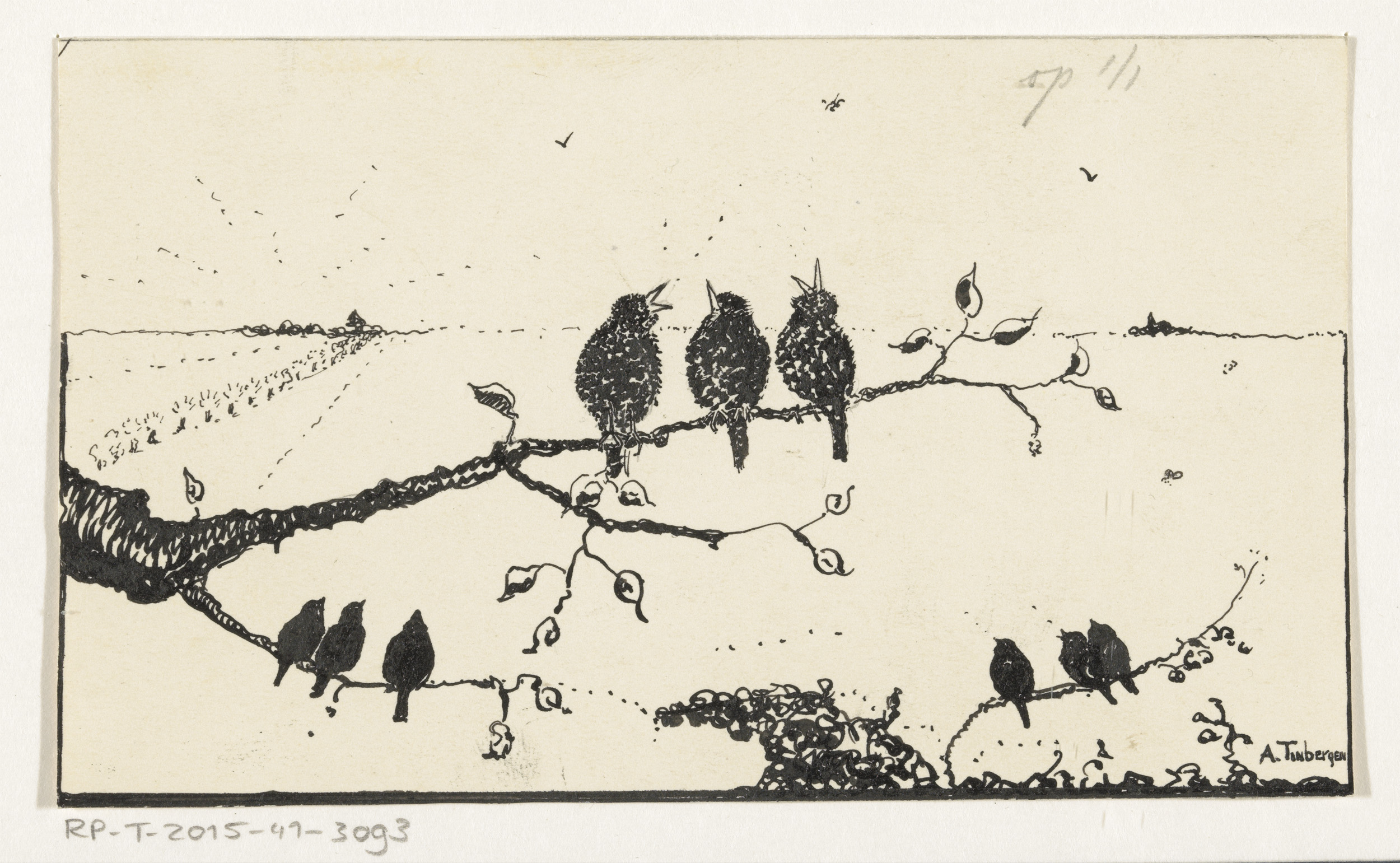 Negen vogels op boomtakken