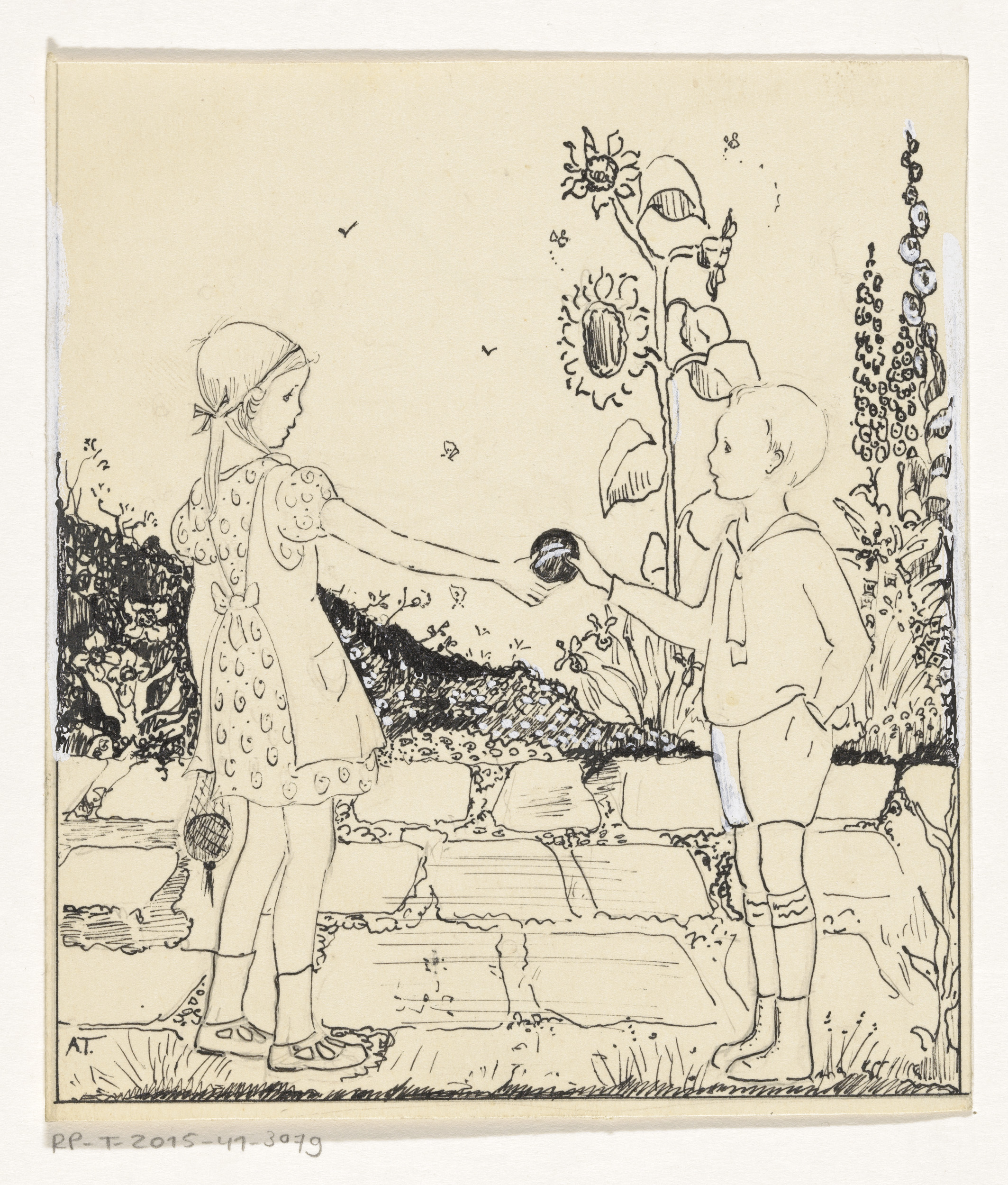 Jongen en meisje op een tuinpad