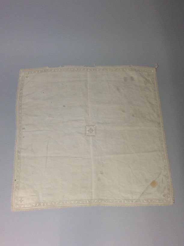Cremekleurig kleedje met filetknoopwerk en naaldkant...