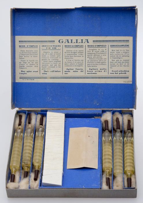 Zes glazen ampullen en andere benodigdheden voor wat...