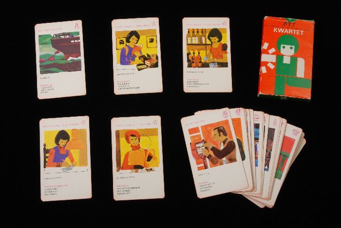 PTT kwartetspel in oranje doos met groen-witte figuur