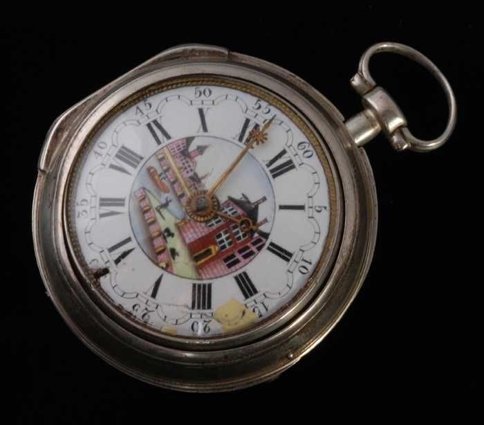 Zakhorloge met emaille wijzerplaat met havenkade-taf...