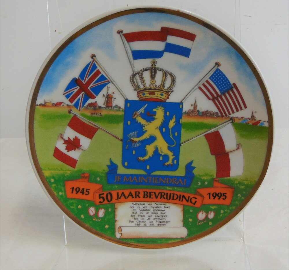 Bord groen-blauw met 5 vlaggen, een Nederlandse leeu...