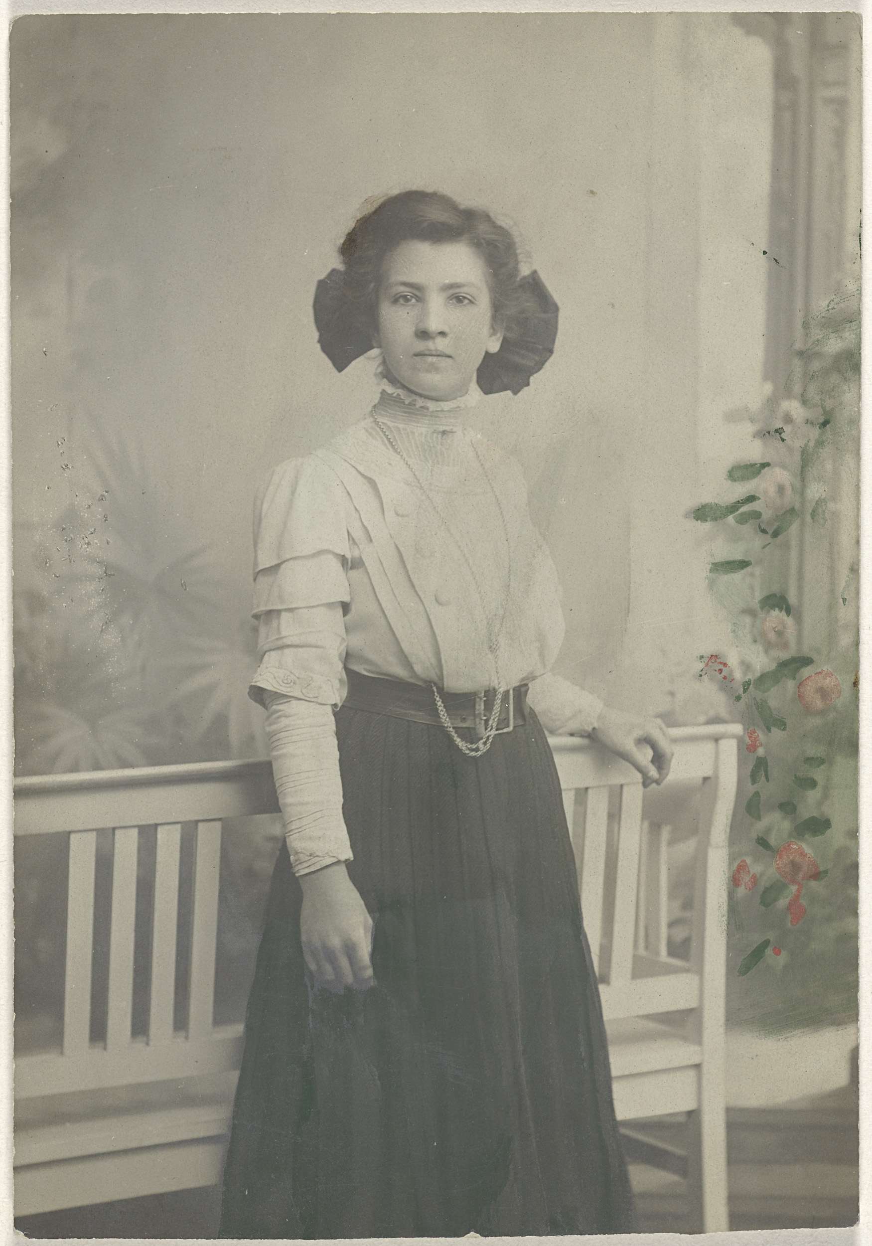 Studioportret van jonge vrouw bij een zitbank
