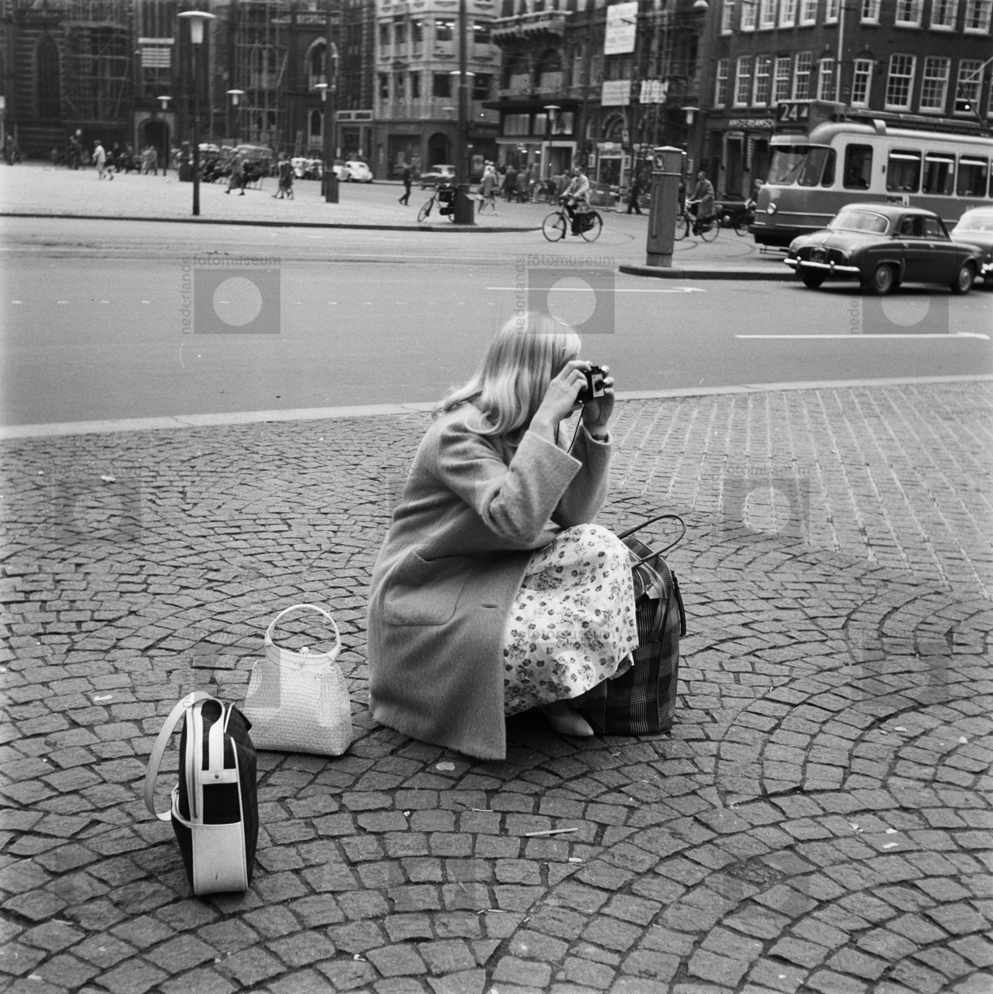Amsterdam. Dam. Jonge vrouw zit op haar hurken en ma...