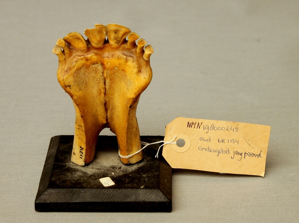 Paard; voorste deel onderkaak; op plank gemonteerd