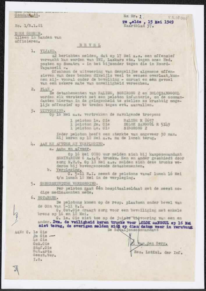 Afschrift van een bevel van commandant 424 Bataljon ...