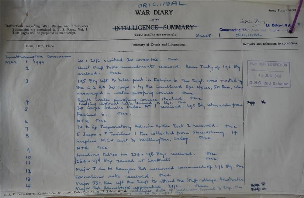 War Diary 73rd Anti Tank Regiment RA, mei 1944, inco...
