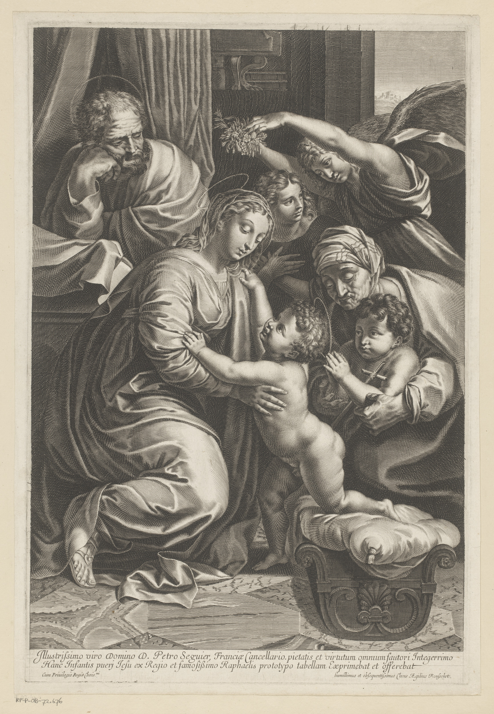 Heilige Familie en engel die een wieg opmaakt