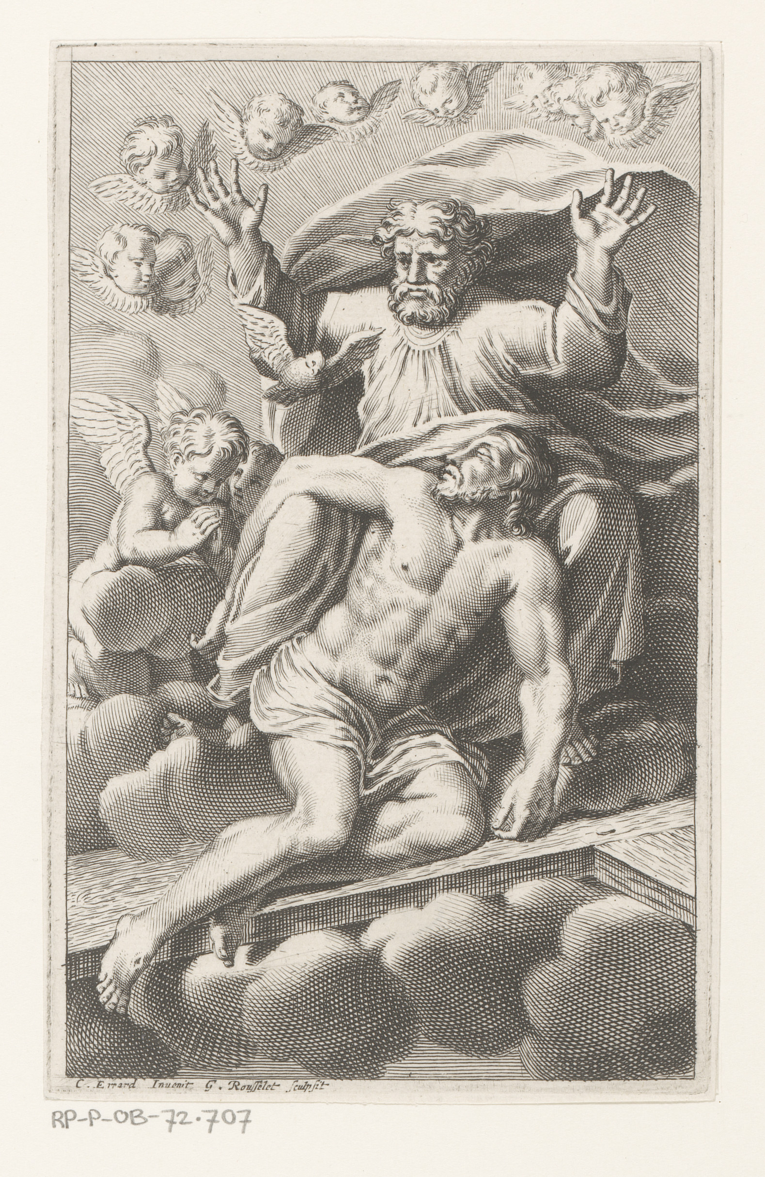 Drieëenheid op wolken omgeven door cherubs