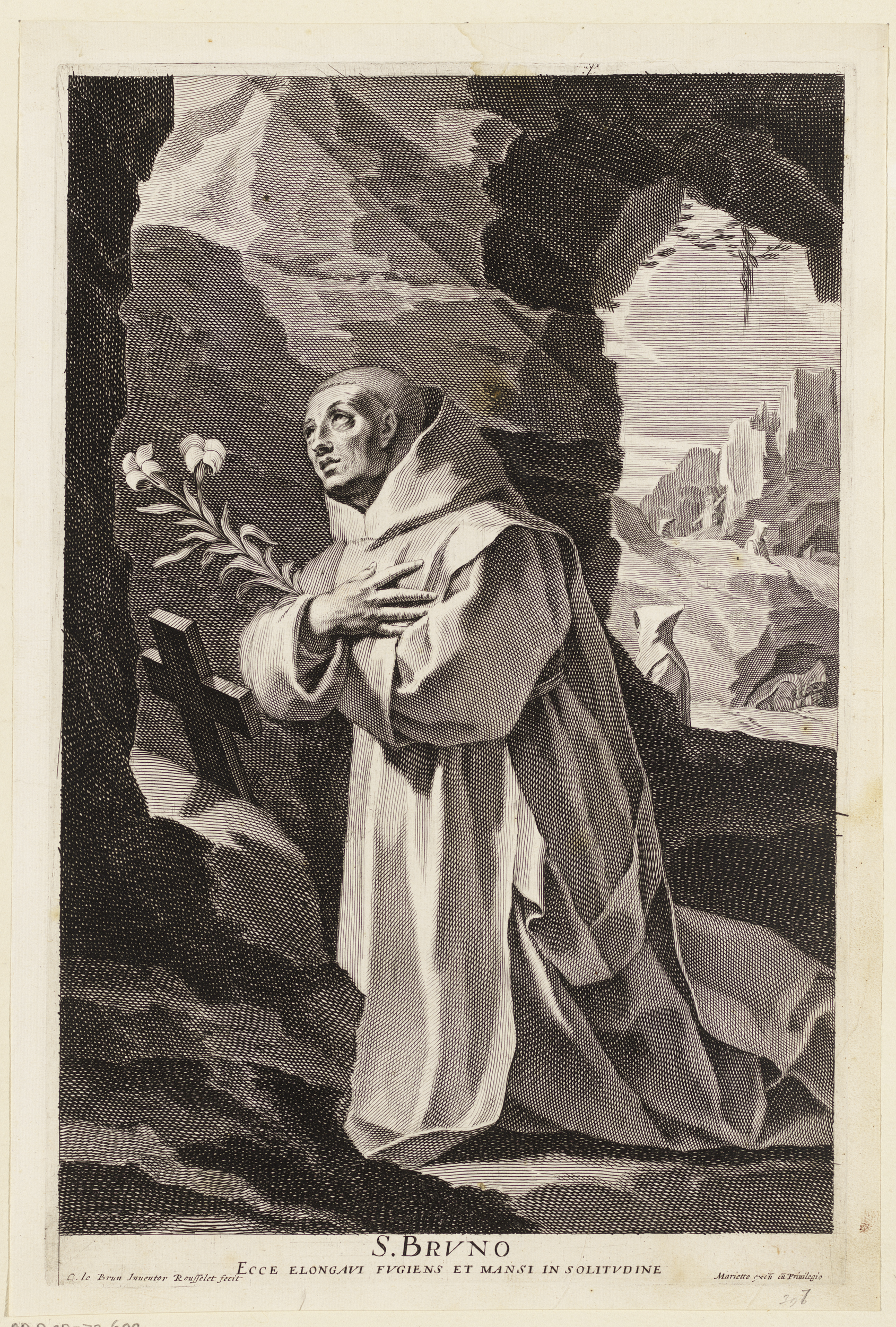 Heilige Bruno knielend voor een kruis