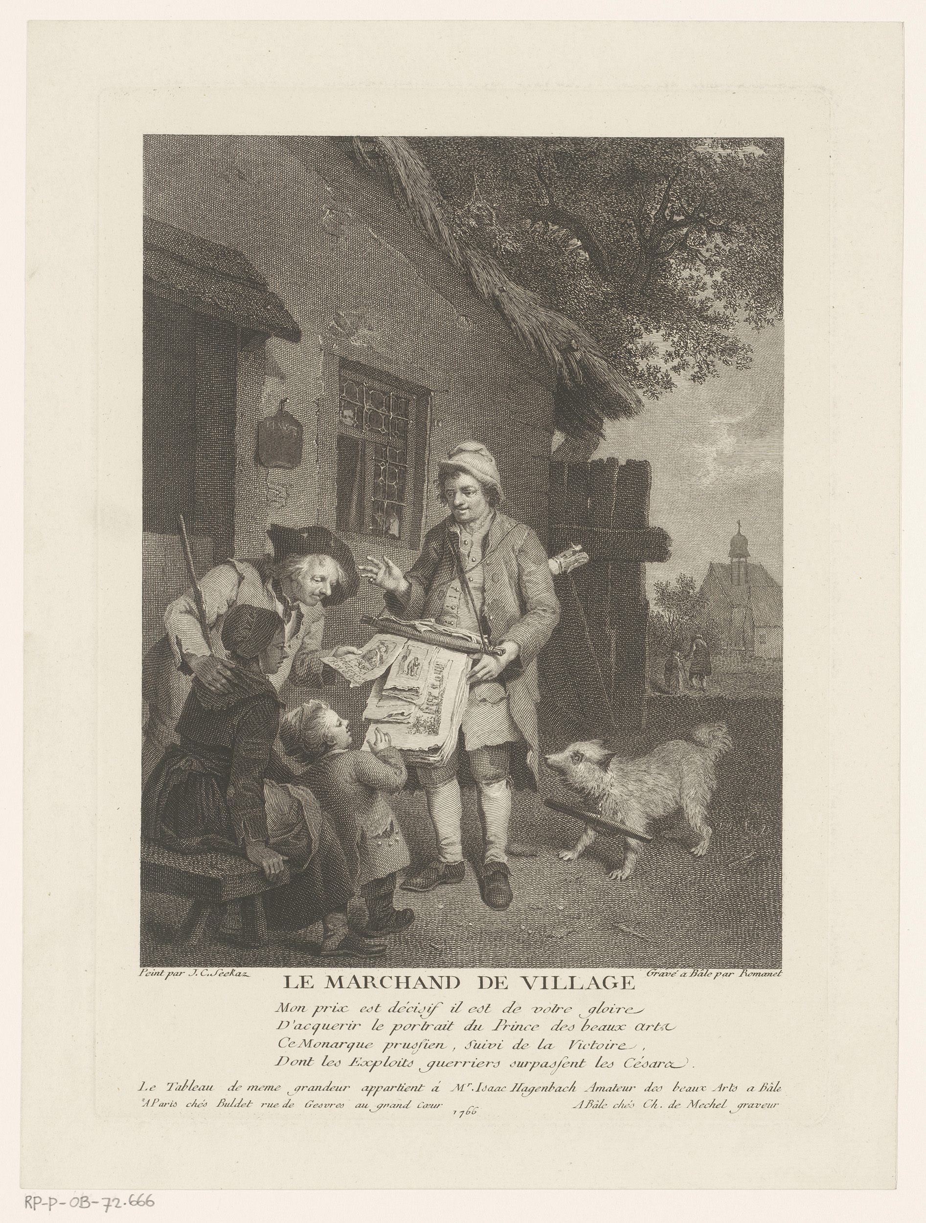Dorpsgezicht met prentverkoper bij een man en twee k...
