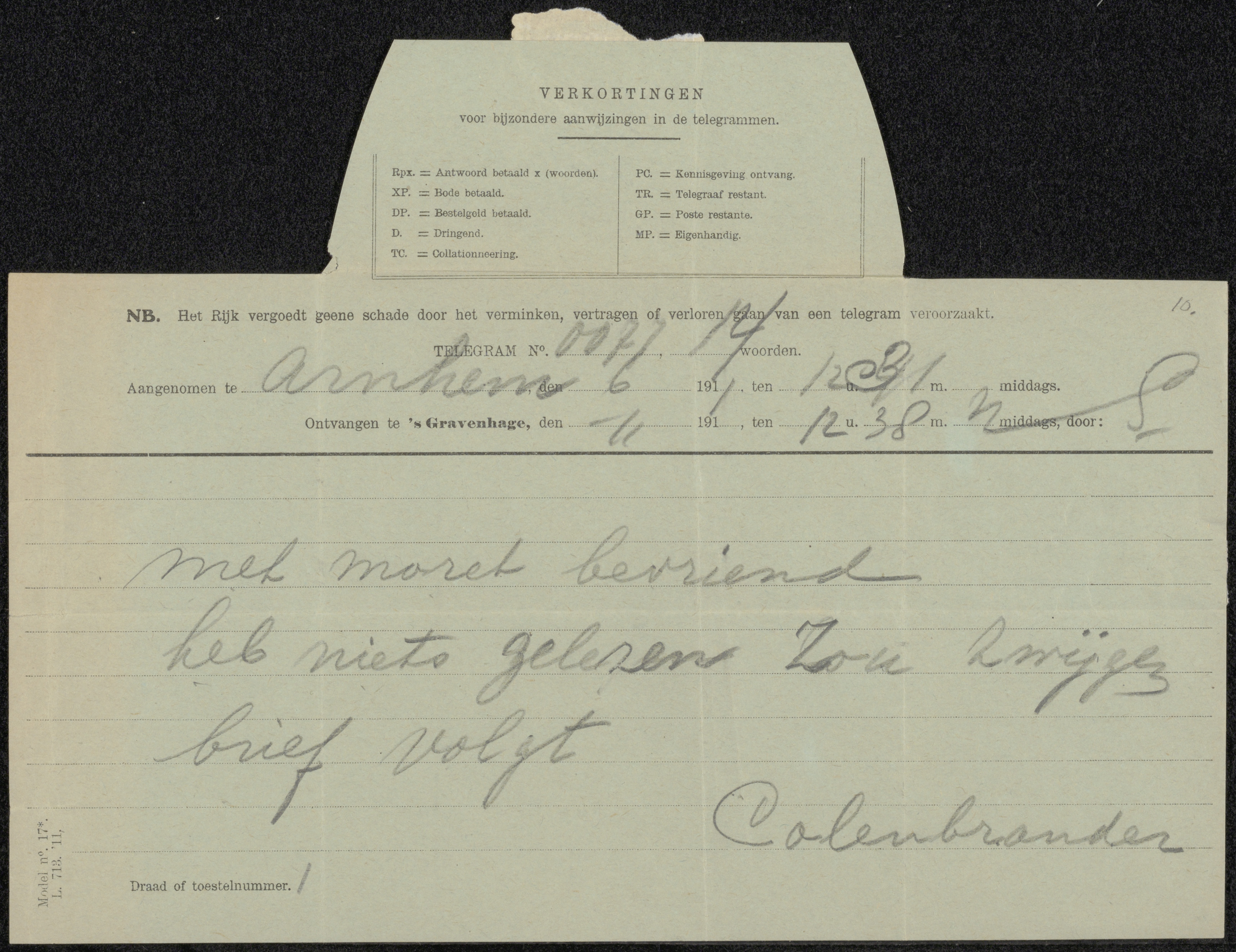 Telegram aan Pieter Haverkorn van Rijsewijk