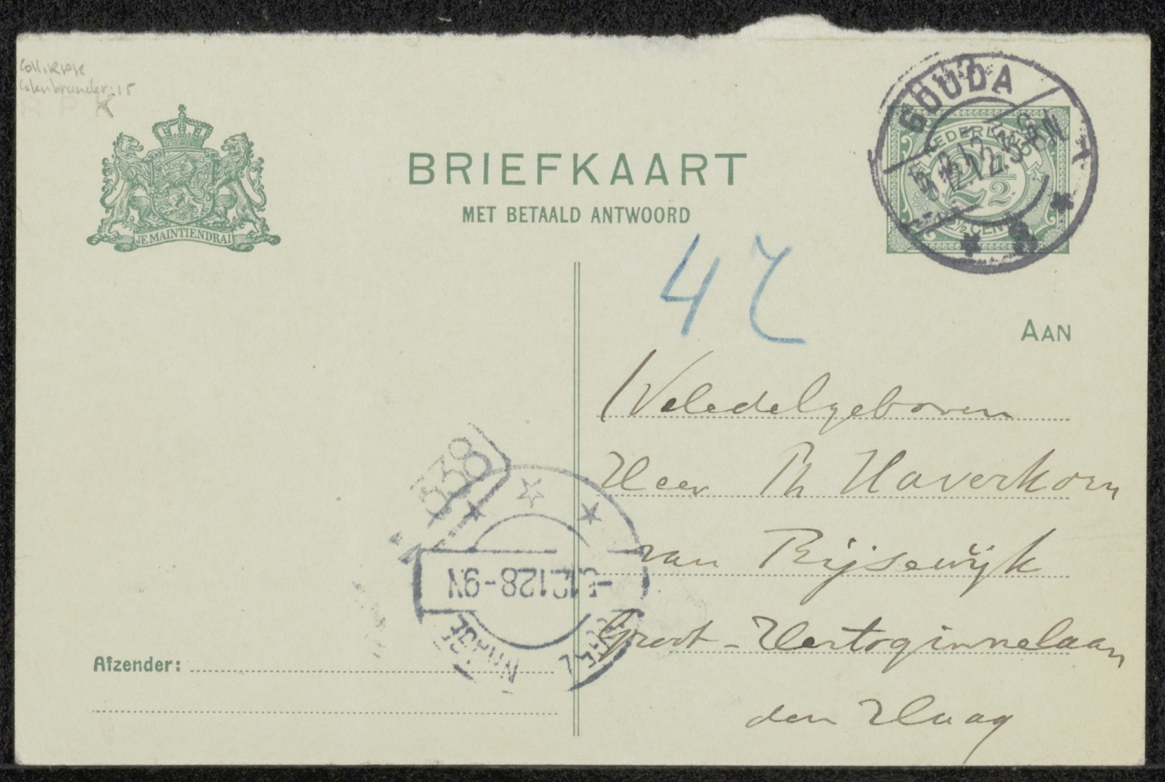 Briefkaart aan Pieter Haverkorn van Rijsewijk