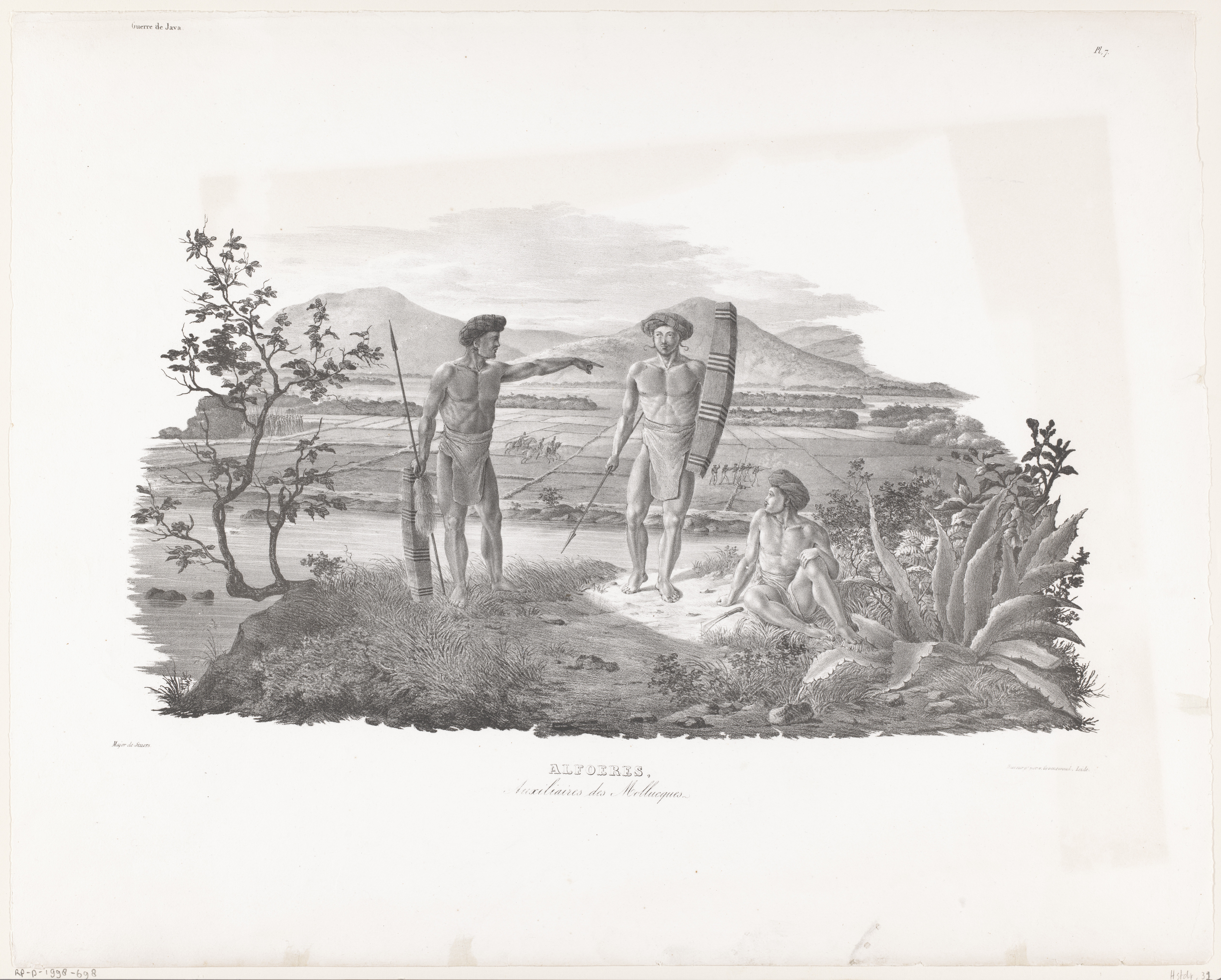 Drie Molukkse mannen in een landschap